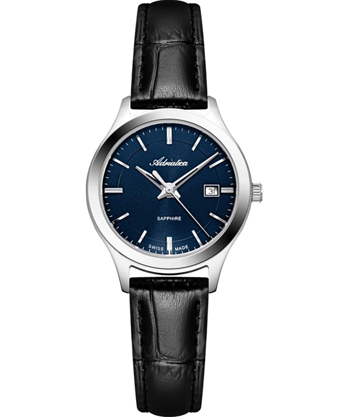 Женские швейцарские часы Adriatica Classic A3195.5215Q имеют кварцевый механизм с высокой точностью. Корпус часов изготовлен из нержавеющей стали. Сапфировое стеклоСапфировое стеклоПрочный и надёжный материал из кристалла сапфира синтетического происхождения, характеризующийся особой твёрдостью и устойчивостью к царапинам и повреждениям. устойчивое к появлению царапин, обладающее высокой прозрачностью, защищает синий циферблат, на котором расположилось окошко даты в районе 3 часа. Кожаный черный ремешок со стандартной застежкой обеспечивает комфортное ношение и подчеркивает стильный внешний вид. Надежный кварцевый механизм с калибром RONDA 785 гарантирует точность времени, а водозащита 50 метров, что позволит защитить корпус от случайных брызг или капель дождя.