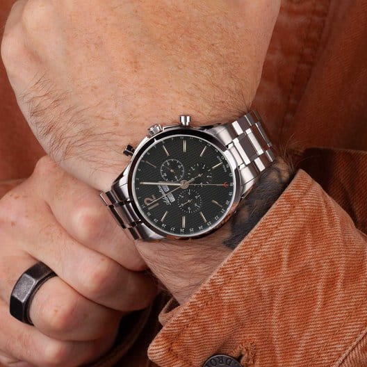 Мужские швейцарские часы-хронографХронографФункция позволяет измерять отрезки времени с особой точностью: часы, минуты, секунды. Верным признаком хронографа является наличие на циферблате 3 дополнительных окошек-счётчиков. с секундомеромСекундомерСекундоме́р — прибор, способный измерять интервалы времени с точностью до долей секунды. Adriatica Passion A8283.5154CH имеют кварцевый механизм с высокой точностью. Сапфировое стеклоСапфировое стеклоПрочный и надёжный материал из кристалла сапфира синтетического происхождения, характеризующийся особой твёрдостью и устойчивостью к царапинам и повреждениям. устойчивое к появлению царапин, обладающее высокой прозрачностью защищает текстурированный черный циферблат с метками в виде штрихов и арабской цифры 12. Месяц и день недели отображаются в отдельных окошках, а дата отображается центральной стрелкой, также часы имеют 3 дополнительных циферблата. Корпус часов изготовлен из нержавеющей стали. На часовую, минутную стрелки нанесено люминесцентное покрытиеЛюминесцентное покрытиеПозволяет считывать показания времени в темноте. Производители наносят на стрелки, часовые индексы, безель или поверхность циферблата светонакопительный состав, дающий холодное свечение., которое светится в темноте, создавая необычное изображение. Стальной браслет с раскладной застёжкойРаскладная застёжкаТакой тип застёжки используется только на браслетах из металла. Она никогда не раскрывается полностью, происходит разделение на 2 и более частей. Раскладывающая застёжка снизит вероятность потери часов к минимуму. обеспечивает комфортное ношение и надежную фиксацию на запястье. Надежный кварцевый механизм с калибром RONDA 5040.F гарантирует точность времени, а водозащита 50 метров, позволит плавать, что позволит защитить корпус от случайных брызг или капель дождя.