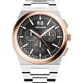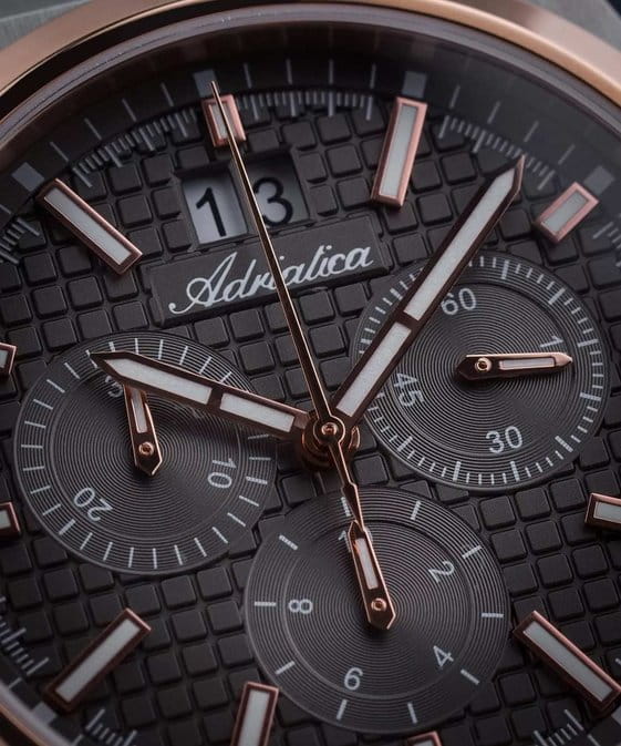 Мужские швейцарские часы-хронографХронографФункция позволяет измерять отрезки времени с особой точностью: часы, минуты, секунды. Верным признаком хронографа является наличие на циферблате 3 дополнительных окошек-счётчиков. с секундомеромСекундомерСекундоме́р — прибор, способный измерять интервалы времени с точностью до долей секунды.  Adriatica Premiere A8326.R116CH воплощают в себе элегантность и функциональность, идеально подходящие для современных мужчин, ценящих швейцарское качество. Их черный циферблат защищенный сапфировым стекломСапфировое стеклоПрочный и надёжный материал из кристалла сапфира синтетического происхождения, характеризующийся особой твёрдостью и устойчивостью к царапинам и повреждениям., заключен в корпус из нержавеющей стали диаметром 40 мм и толщиной 10 мм, а на безельБезельВнешний ободок, закрепляющий стекло. В спортивных часах так называется поворотное кольцо с делениями на циферблате, выполняет роль таймера – замеряет отрезки времени на шкале. Неподвижный безель – элемент декора. Однонаправленно вращающийся безель на дайверских часах позволяет фиксировать моменты погружения и выныривания на поверхность. нанесено PVDPVDУльтратонкое покрытие наносится в технике вакуумного напыления, сочетает в себе нитрид титана особой прочности со слоем золота или оксида хрома. Несёт в себе декоративную или защитную функцию. покрытие. Надежный кварцевый механизм с калибром Ronda 5040.B обеспечивает высокую точность, а водозащита 5 ATM делает часы устойчивыми к воздействию воды. Стальной браслет с раскладной застёжкойРаскладная застёжкаТакой тип застёжки используется только на браслетах из металла. Она никогда не раскрывается полностью, происходит разделение на 2 и более частей. Раскладывающая застёжка снизит вероятность потери часов к минимуму. обеспечивает комфортное и надежное ношение. Фактурный циферблат с метками в виде штрихов дополнен рисунком в клетку, а окошко даты находится в положении 12 часов, что добавляет практичности в повседневной жизни. Люминесцентное покрытиеЛюминесцентное покрытиеПозволяет считывать показания времени в темноте. Производители наносят на стрелки, часовые индексы, безель или поверхность циферблата светонакопительный состав, дающий холодное свечение. на стрелках и метках обеспечивает отличную видимость в темноте.