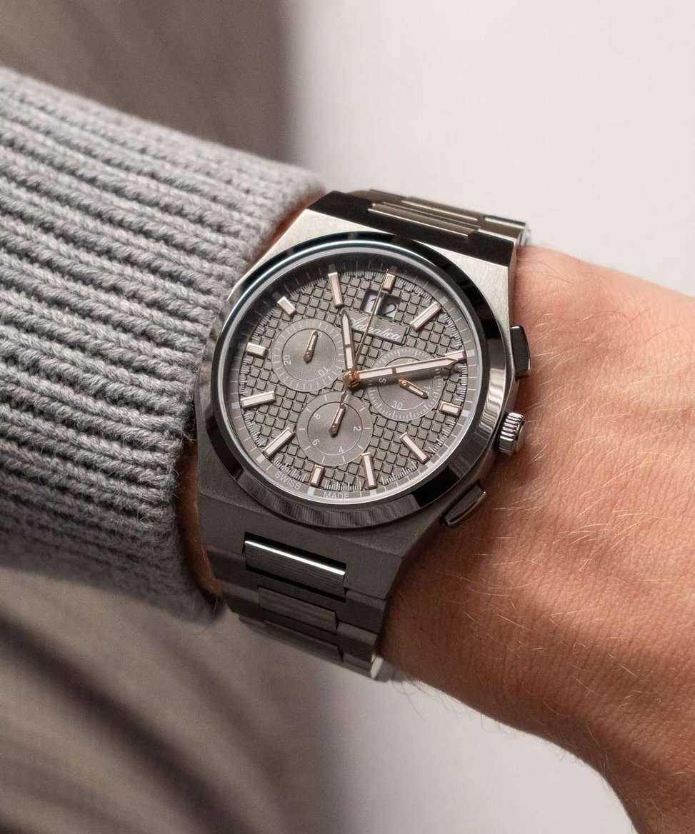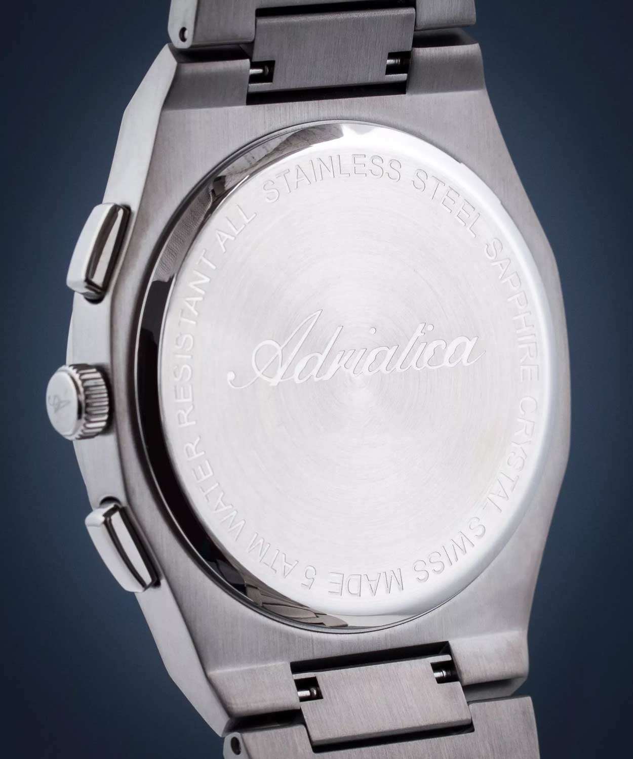 Мужские швейцарские часы-хронографХронографФункция позволяет измерять отрезки времени с особой точностью: часы, минуты, секунды. Верным признаком хронографа является наличие на циферблате 3 дополнительных окошек-счётчиков. с секундомеромСекундомерСекундоме́р — прибор, способный измерять интервалы времени с точностью до долей секунды.  Adriatica Premiere A8326.S1R6CH воплощают в себе элегантность и функциональность, идеально подходящие для современных мужчин, ценящих швейцарское качество. Их черный циферблат защищенный сапфировым стекломСапфировое стеклоПрочный и надёжный материал из кристалла сапфира синтетического происхождения, характеризующийся особой твёрдостью и устойчивостью к царапинам и повреждениям., заключен в корпус и безельБезельВнешний ободок, закрепляющий стекло. В спортивных часах так называется поворотное кольцо с делениями на циферблате, выполняет роль таймера – замеряет отрезки времени на шкале. Неподвижный безель – элемент декора. Однонаправленно вращающийся безель на дайверских часах позволяет фиксировать моменты погружения и выныривания на поверхность. из нержавеющей стали с черным PVDPVDУльтратонкое покрытие наносится в технике вакуумного напыления, сочетает в себе нитрид титана особой прочности со слоем золота или оксида хрома. Несёт в себе декоративную или защитную функцию. покрытием диаметром 40 мм и толщиной 10 мм. Надежный кварцевый механизм с калибром Ronda 5040.B обеспечивает высокую точность, а водозащита 5 ATM делает часы устойчивыми к воздействию воды. Стальной браслет с черным PVDPVDУльтратонкое покрытие наносится в технике вакуумного напыления, сочетает в себе нитрид титана особой прочности со слоем золота или оксида хрома. Несёт в себе декоративную или защитную функцию. покрытием и раскладной застёжкойРаскладная застёжкаТакой тип застёжки используется только на браслетах из металла. Она никогда не раскрывается полностью, происходит разделение на 2 и более частей. Раскладывающая застёжка снизит вероятность потери часов к минимуму. обеспечивает комфортное и надежное ношение. Фактурный циферблат с метками в виде штрихов дополнен рисунком в клетку, а окошко даты находится в положении 12 часов, что добавляет практичности в повседневной жизни. Люминесцентное покрытиеЛюминесцентное покрытиеПозволяет считывать показания времени в темноте. Производители наносят на стрелки, часовые индексы, безель или поверхность циферблата светонакопительный состав, дающий холодное свечение. на стрелках и метках обеспечивает отличную видимость в темноте.