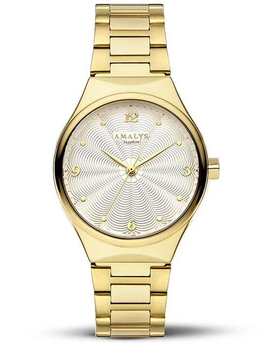 Amalys AMW-158 — женская модель с утончённым современным дизайном, в которой сочетаются минимализм и элегантность. Круглый корпус с PVD-покрытиемPVDУльтратонкое покрытие наносится в технике вакуумного напыления, сочетает в себе нитрид титана особой прочности со слоем золота или оксида хрома. Несёт в себе декоративную или защитную функцию. диаметром 31 мм гармонирует с браслетом с PVD-покрытиемPVDУльтратонкое покрытие наносится в технике вакуумного напыления, сочетает в себе нитрид титана особой прочности со слоем золота или оксида хрома. Несёт в себе декоративную или защитную функцию. шириной 16 мм, выполненным из нержавеющей стали и оснащённым раскладным замкомРаскладной замокДанный вариант застежки используется только на часах с металлическим браслетом. Отличительная особенность такого крепления в том, что длина браслета становится универсальной и вы можете самостоятельно отрегулировать нужный вам размер – застежка просто двигается по браслету часов., обеспечивающим удобство и надёжность при носке. Механизм — кварцевый, что гарантирует точный и стабильный ход. Защитную функцию выполняет сапфировое стеклоСапфировое стеклоПрочный и надёжный материал из кристалла сапфира синтетического происхождения, характеризующийся особой твёрдостью и устойчивостью к царапинам и повреждениям., стойкое к царапинам и сохраняющее прозрачность. Водозащита 5 ATM делает модель устойчивой к случайным брызгам и кратковременному контакту с водой. Лаконичный циферблат с декоративным узором и изящными стрелками подчёркивает изысканный характер часов, создавая универсальный образ, подходящий как для повседневных ситуаций, так и для особых случаев.