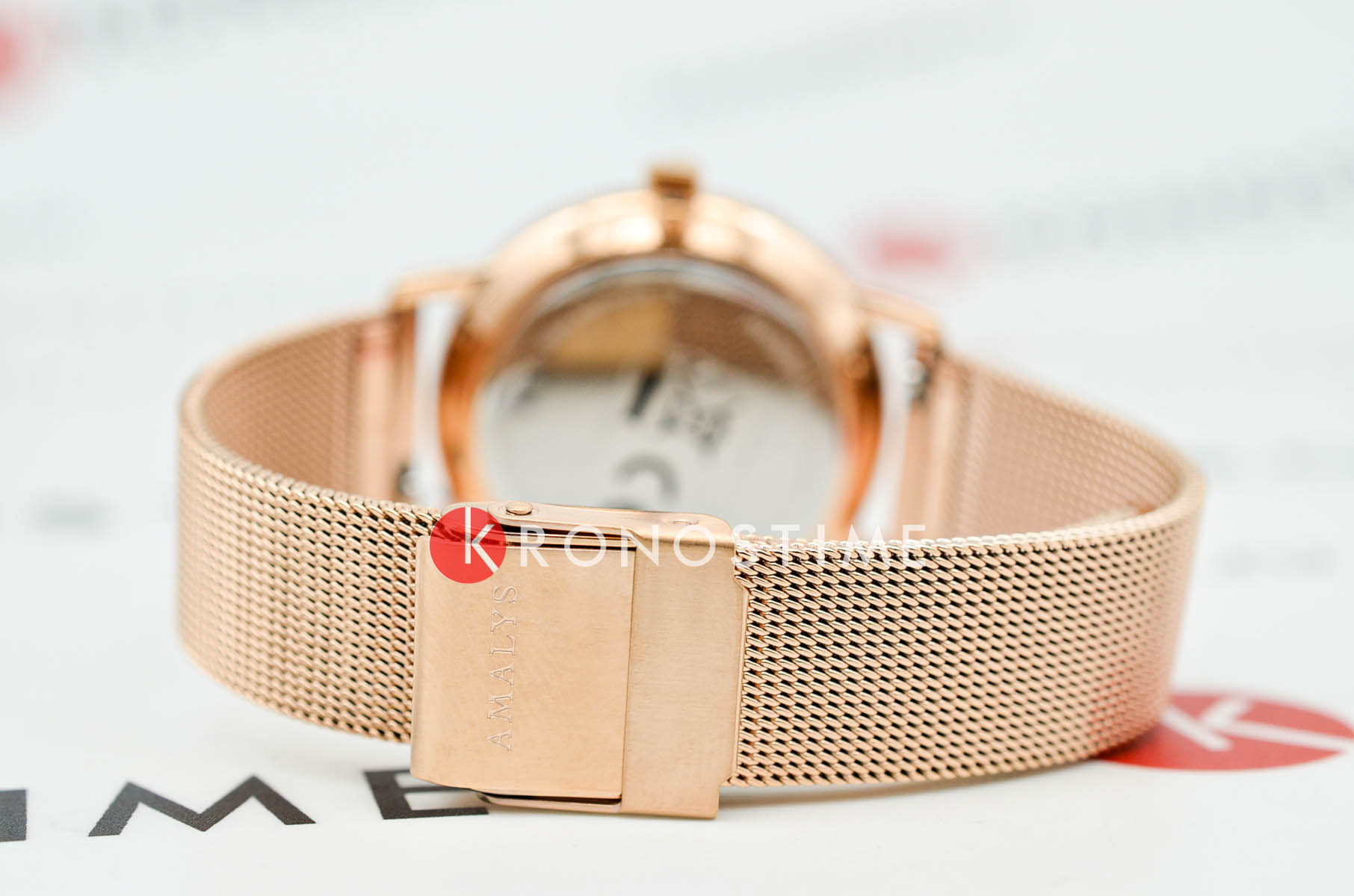 Amalys AMW-192 — женский набор, включающий часы и браслет, выполненный в едином элегантном стиле. Круглый корпус диаметром 33 мм изготовлен из нержавеющей стали с PVDPVDУльтратонкое покрытие наносится в технике вакуумного напыления, сочетает в себе нитрид титана особой прочности со слоем золота или оксида хрома. Несёт в себе декоративную или защитную функцию.-покрытием тёплого золотистого оттенка, что подчёркивает изысканный характер модели. Защитную функцию выполняет сапфировое стеклоСапфировое стеклоПрочный и надёжный материал из кристалла сапфира синтетического происхождения, характеризующийся особой твёрдостью и устойчивостью к царапинам и повреждениям., стойкое к царапинам и сохраняющее прозрачность. Механизм — кварцевый, обеспечивающий точность хода и удобство в использовании. Водозащита 3 ATM защищает от случайных брызг и дождя. Циферблат оформлен в минималистичном стиле с тонкими метками и изящными стрелками, подчёркивающими женственный образ. Стальной браслет миланского плетения с PVDPVDУльтратонкое покрытие наносится в технике вакуумного напыления, сочетает в себе нитрид титана особой прочности со слоем золота или оксида хрома. Несёт в себе декоративную или защитную функцию.-покрытием на раскладном замкеРаскладной замокДанный вариант застежки используется только на часах с металлическим браслетом. Отличительная особенность такого крепления в том, что длина браслета становится универсальной и вы можете самостоятельно отрегулировать нужный вам размер – застежка просто двигается по браслету часов. мягко облегает запястье и гармонично сочетается с корпусом. Дополняющий набор браслет усиливает впечатление цельности и придаёт образу завершённость.
