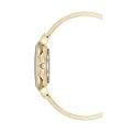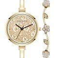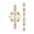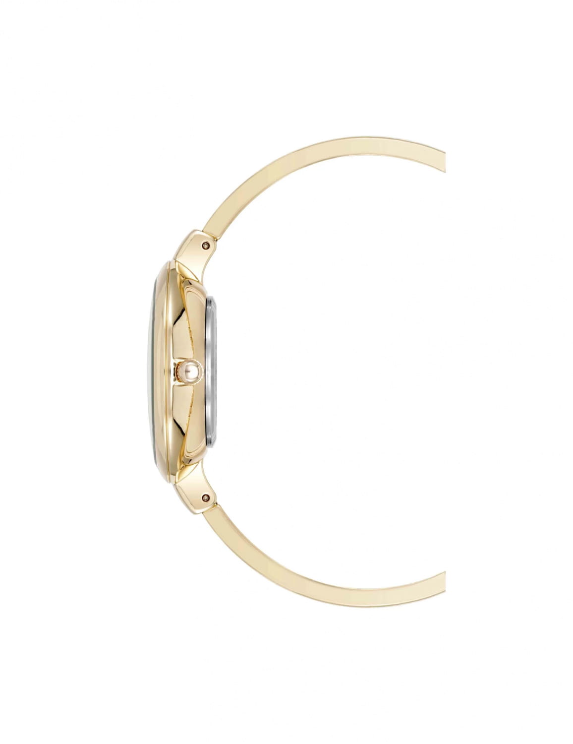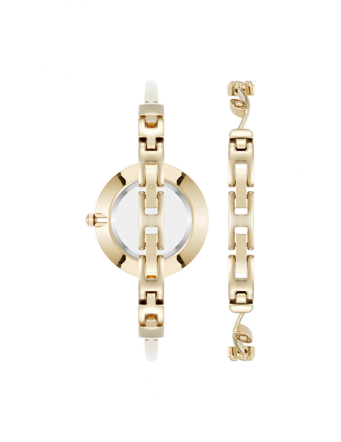 Женские кварцевые часы Anne Klein Box Set 5274GPST представляют собой элегантный аксессуар с круглым корпусом 32 мм из стали с IP-покрытиемIP-покрытиеМетод ионного напыления. Демонстрирует повышенную устойчивость к истиранию, окислению и химическим веществам. Под воздействием высокого давления и температуры около 1500°C молекулы металла надёжно соединяются с частицами корпуса часов. цвета желтого золота. Модель оснащена кварцевым механизмом с точностью хода ±20 секунд в месяц. Циферблат с черными стрелками защищен минеральным стекломМинеральное стеклоМинеральное стекло представляет собой искусственно выращенный минерал кварца. Такое стекло отличается особой устойчивостью к повреждениям и царапинам. Уступает по некоторым качествам сапфировому стеклу., устойчивым к царапинам. Водонепроницаемость 30 метров (3 атм) обеспечивает защиту от брызг и дождя. Изысканный браслет из нержавеющей стали с IP-покрытиемIP-покрытиеМетод ионного напыления. Демонстрирует повышенную устойчивость к истиранию, окислению и химическим веществам. Под воздействием высокого давления и температуры около 1500°C молекулы металла надёжно соединяются с частицами корпуса часов. и с ювелирной застежкой гармонично сочетается с корпусом, создавая целостный образ. Часы отличаются утонченным профилем и комфортной посадкой на запястье. Прилагается дополнительный браслет с кристаллами.