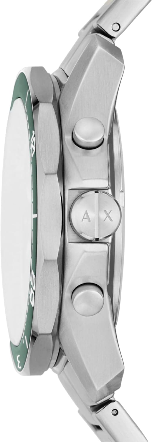 Мужские наручные часы хронографХронографФункция позволяет измерять отрезки времени с особой точностью: часы, минуты, секунды. Верным признаком хронографа является наличие на циферблате 3 дополнительных окошек-счётчиков. с минеральным стекломМинеральное стеклоМинеральное стекло представляет собой искусственно выращенный минерал кварца. Такое стекло отличается особой устойчивостью к повреждениям и царапинам. Уступает по некоторым качествам сапфировому стеклу. Armani Exchange Dante AX1957, кварцевый механизм с высокой точностью. Класс водозащиты: 100 метров, позволит плавать, нырять и заниматься другими водными видами спорта. Корпус часов изготовлен из нержавеющей стали. Стальной браслет на раскладной застёжкеРаскладная застёжкаТакой тип застёжки используется только на браслетах из металла. Она никогда не раскрывается полностью, происходит разделение на 2 и более частей. Раскладывающая застёжка снизит вероятность потери часов к минимуму.. Вращающийся безельБезельВнешний ободок, закрепляющий стекло. В спортивных часах так называется поворотное кольцо с делениями на циферблате, выполняет роль таймера – замеряет отрезки времени на шкале. Неподвижный безель – элемент декора. Однонаправленно вращающийся безель на дайверских часах позволяет фиксировать моменты погружения и выныривания на поверхность.. Текстурированный циферблат с метками в виде штрихов.