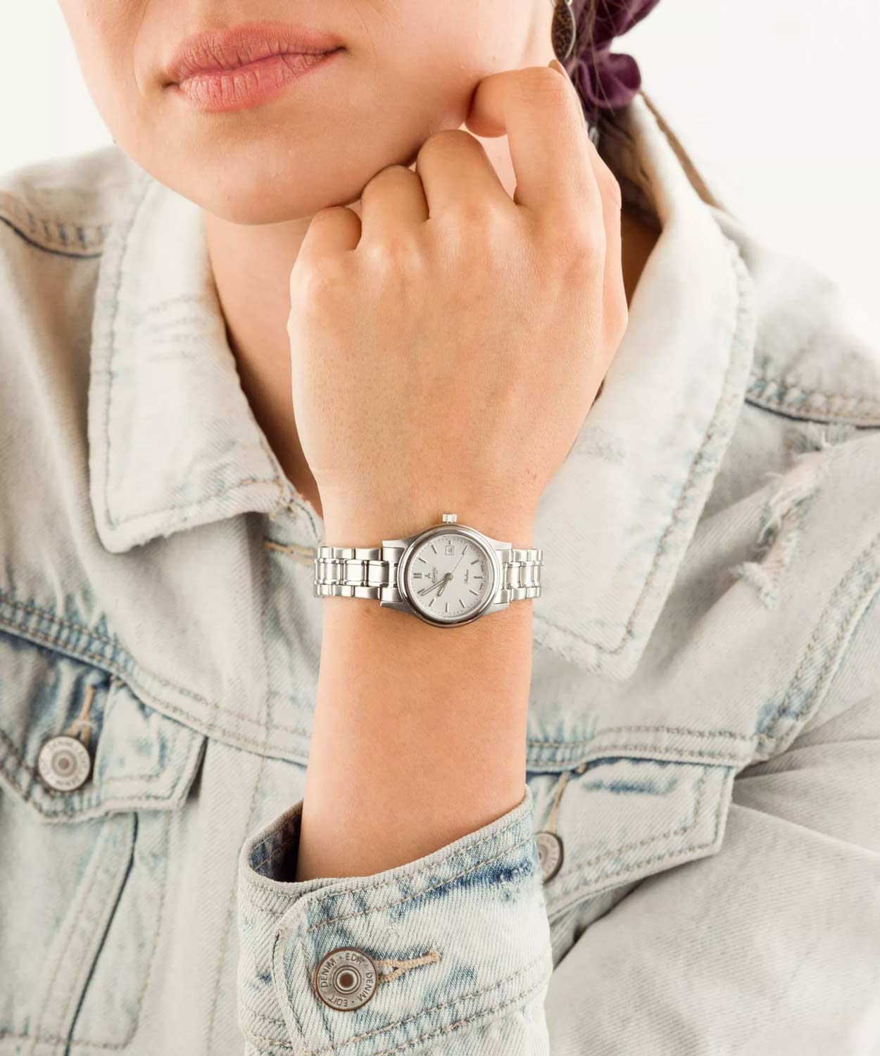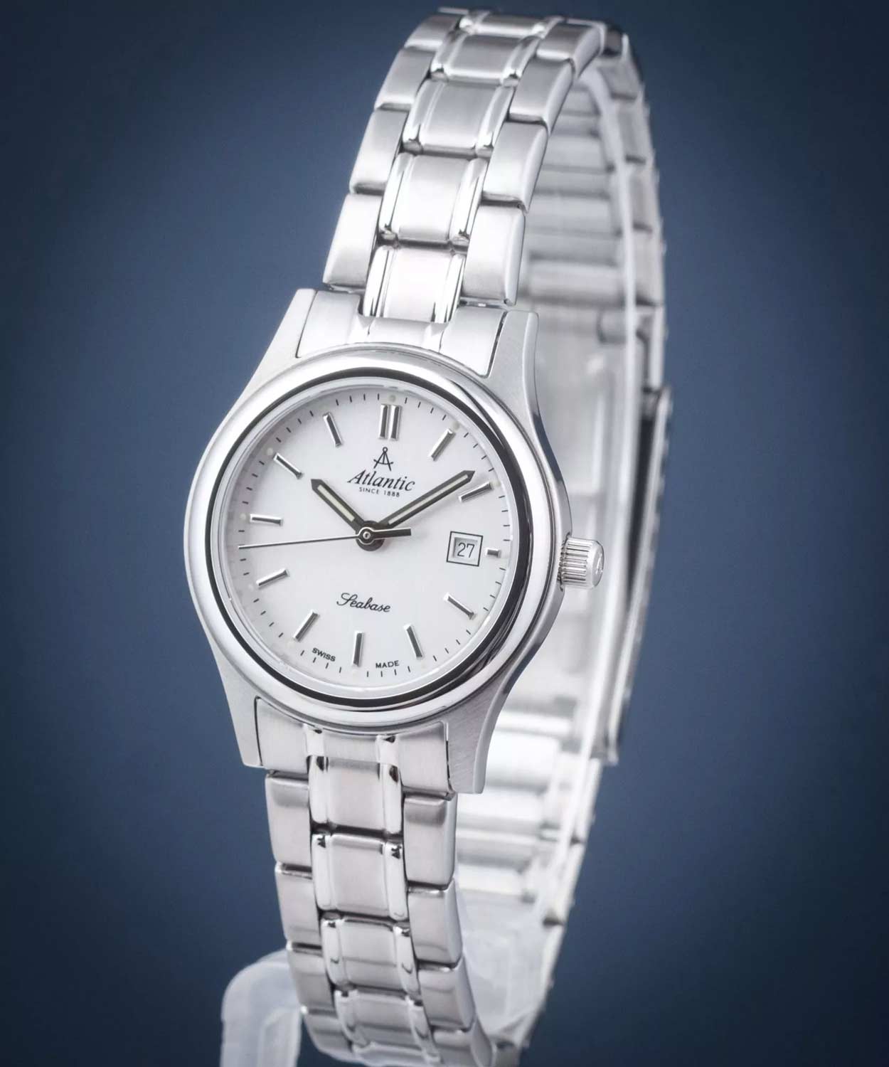 Женские швейцарские часы Atlantic Seapair Ladies 20348.41.21, кварцевый механизм с высокой точностью. Циферблат часов с люминесцентным покрытиемЛюминесцентное покрытиеПозволяет считывать показания времени в темноте. Производители наносят на стрелки, часовые индексы, безель или поверхность циферблата светонакопительный состав, дающий холодное свечение. стрелок и меток, дополнен сапфировым стекломСапфировое стеклоПрочный и надёжный материал из кристалла сапфира синтетического происхождения, характеризующийся особой твёрдостью и устойчивостью к царапинам и повреждениям., устойчивым к появлению царапин и обладающее высокой прозрачностью. Класс водозащиты: 30 метров, позволит защитить корпус от случайных брызг или капель дождя. Корпус часов изготовлен из нержавеющей стали. Стальной браслет с раскладной застёжкойРаскладная застёжкаТакой тип застёжки используется только на браслетах из металла. Она никогда не раскрывается полностью, происходит разделение на 2 и более частей. Раскладывающая застёжка снизит вероятность потери часов к минимуму.. Окошко даты находится в положении 3 часа.