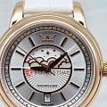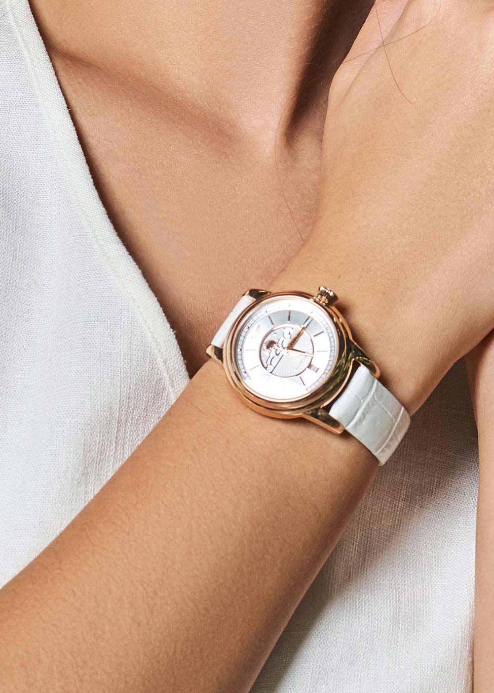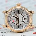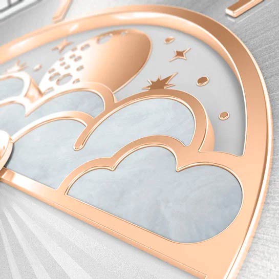 Циферблат в стиле Art Deco украшает усложнение фаз Луны в верхней половине, обрамлённой тонким кольцом облаков. Отмечено окно даты в положении «6 часов». Стрелки и накладные метки обработаны люминесцентным покрытиемЛюминесцентное покрытиеПозволяет считывать показания времени в темноте. Производители наносят на стрелки, часовые индексы, безель или поверхность циферблата светонакопительный состав, дающий холодное свечение. Superluminova — для уверенного считывания в темноте. Поверхность защищена сапфировым стекломСапфировое стеклоПрочный и надёжный материал из кристалла сапфира синтетического происхождения, характеризующийся особой твёрдостью и устойчивостью к царапинам и повреждениям. с антибликовым покрытием.