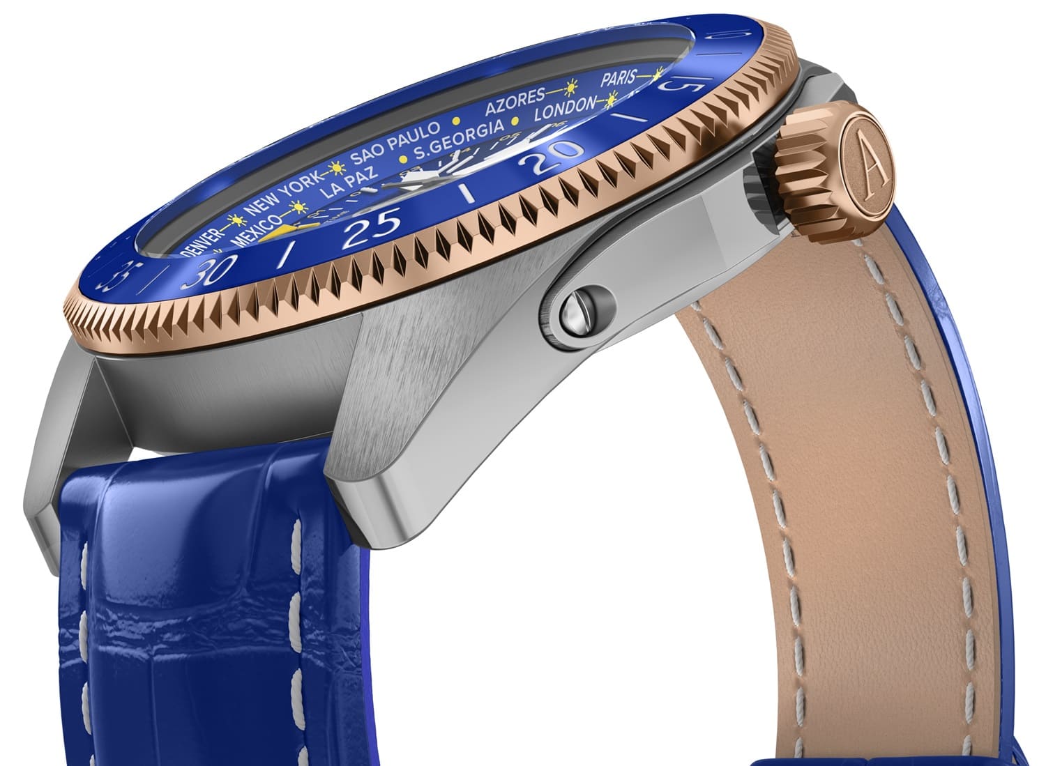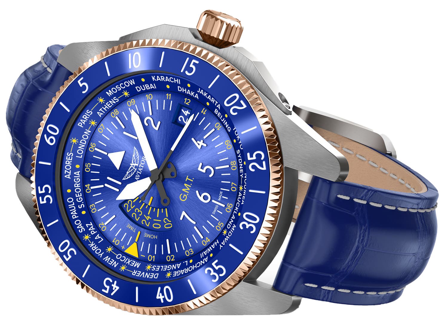 Aviator Airacobra GMT V.1.37.3.308.4 — сбалансированный швейцарский пилотский GMT, сочетающий техническую строгость с удобными функциями для путешествий. Корпус диаметром 42.8 мм из нержавеющей стали 316 L обеспечивает уверенное ощущение надёжности, а герметичность до 100 м защищает при любой погоде. Циферблат отличается детальной функциональностью: в центре — крупные арабские цифры и стрелки, покрытые люминесцентным покрытиемЛюминесцентное покрытиеПозволяет считывать показания времени в темноте. Производители наносят на стрелки, часовые индексы, безель или поверхность циферблата светонакопительный состав, дающий холодное свечение. Superluminova, обеспечивающими мгновенное считывание времени даже в темноте. На «3 часах» — окошко даты, а индикатор второго часового пояса (GMT) удобно расположен на «9 часах». С внешней стороны — вращающийся безельБезельВнешний ободок, закрепляющий стекло. В спортивных часах так называется поворотное кольцо с делениями на циферблате, выполняет роль таймера – замеряет отрезки времени на шкале. Неподвижный безель – элемент декора. Однонаправленно вращающийся безель на дайверских часах позволяет фиксировать моменты погружения и выныривания на поверхность. с PVD-покрытиемPVDУльтратонкое покрытие наносится в технике вакуумного напыления, сочетает в себе нитрид титана особой прочности со слоем золота или оксида хрома. Несёт в себе декоративную или защитную функцию. и керамической вставкой и градусной шкалой для секунд — идеален для расчёта времени пути или времени прибытия . Циферблат защищён сапфировым стекломСапфировое стеклоПрочный и надёжный материал из кристалла сапфира синтетического происхождения, характеризующийся особой твёрдостью и устойчивостью к царапинам и повреждениям. с антибликовым покрытиемАнтибликовое покрытиеСлой оксида металла в 0,13-0,3 микрон, благодаря которому стекло часов не бликует и не отражает свет. Антибликовое покрытие уменьшает отражение света в 10 раз, обеспечивая отличную читаемость показателей циферблата., гарантирующим чёткий обзор без отражений. Кожаный ремень со стандартной застежкой сочетает в себе комфорт, элегантность и практичность. Airacobra GMT — инструментальное сочетание часовой точности, удобной функциональности GMT и авиационной эстетики, предназначенное для тех, кто ценит практичность и стиль в равной мере.