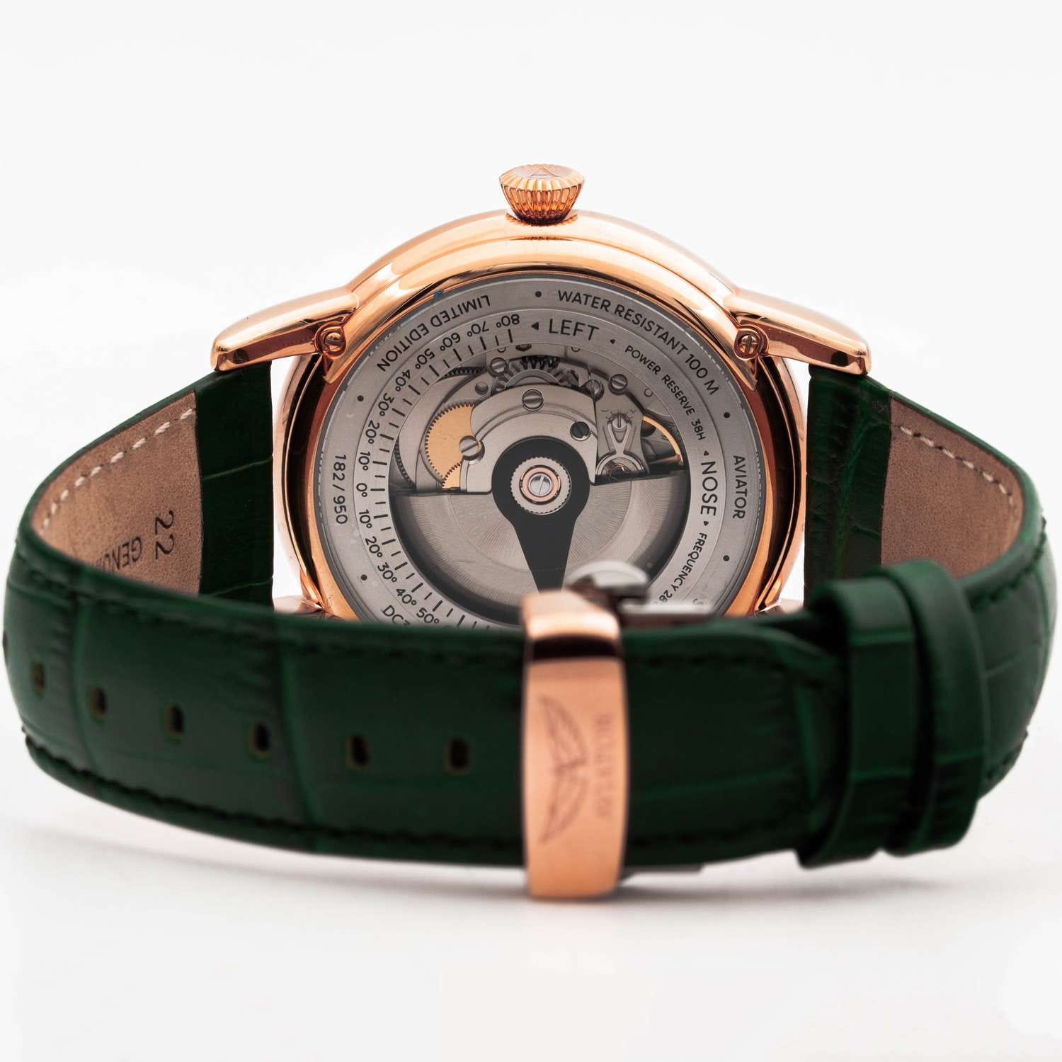 Aviator Douglas DC-3 V.3.32.2.237.4 — швейцарские часы в классике авиадизайна, сочетающие безупречную читаемость и высокую надёжность. Лимитированная серия. Корпус диаметром 45 мм выполнен из нержавеющей стали 316L с PVD-покрытиемPVDУльтратонкое покрытие наносится в технике вакуумного напыления, сочетает в себе нитрид титана особой прочности со слоем золота или оксида хрома. Несёт в себе декоративную или защитную функцию. цвета розового золота. Накладные метки выполнены в виде штрихов. Окошко даты находится в положении 6 часов. Часовые метки и стрелки покрыты люминесцентным покрытиемЛюминесцентное покрытиеПозволяет считывать показания времени в темноте. Производители наносят на стрелки, часовые индексы, безель или поверхность циферблата светонакопительный состав, дающий холодное свечение. Superluminova, позволяющим легко определять время даже в тёмное время суток. Поверхность защищена прочным сапфировым стекломСапфировое стеклоПрочный и надёжный материал из кристалла сапфира синтетического происхождения, характеризующийся особой твёрдостью и устойчивостью к царапинам и повреждениям. с антибликовым покрытием, устойчивым к царапинам. Сердце модели — швейцарский механизм Sellita SW 200, известный своей точностью и долговечностью. Калибр управляется регулятором Etachron , который обеспечивает высокую точность хода как на земле, так и над землей. Водозащита 100 метров, позволит плавать, нырять и заниматься другими водными видами спорта. Завинчивающаяся головка и задняя крышка обеспечивают уверенную ударопрочностьУдаропрочный корпусМеханизм заключён в корпус, выполненный из современных материалов, устойчивых к ударам, механическим повреждениям и падению с высоты: инновационный пластик, карбон, нержавеющая сталь, титан. и надёжную защиту от влаги и пыли. В механизме 26 камней, запас хода 38 часов. Модель дополнена кожаным ремешком с выразительной текстурой и классическим стилем, закреплённым с помощью застёжке-бабочке с кнопкамиЗастёжка "бабочка"Такой вид застёжки дополняется предохранителями, помогающими избежать случайного раскрытия браслета. Обладают изящным исполнением. — для максимального комфорта и лёгкости в повседневном использовании. Циферблат выполнен по технологии sun-ray (солнечные лучи). Коллекция Douglas была разработана в честь известного американского пассажирского самолета Douglas DC-3. Aviator — это образец лётной точности, инженерной чёткости и сдержанной роскоши, идеально подходящий для тех, кто ценит функциональность и уверенность в каждом элементе.