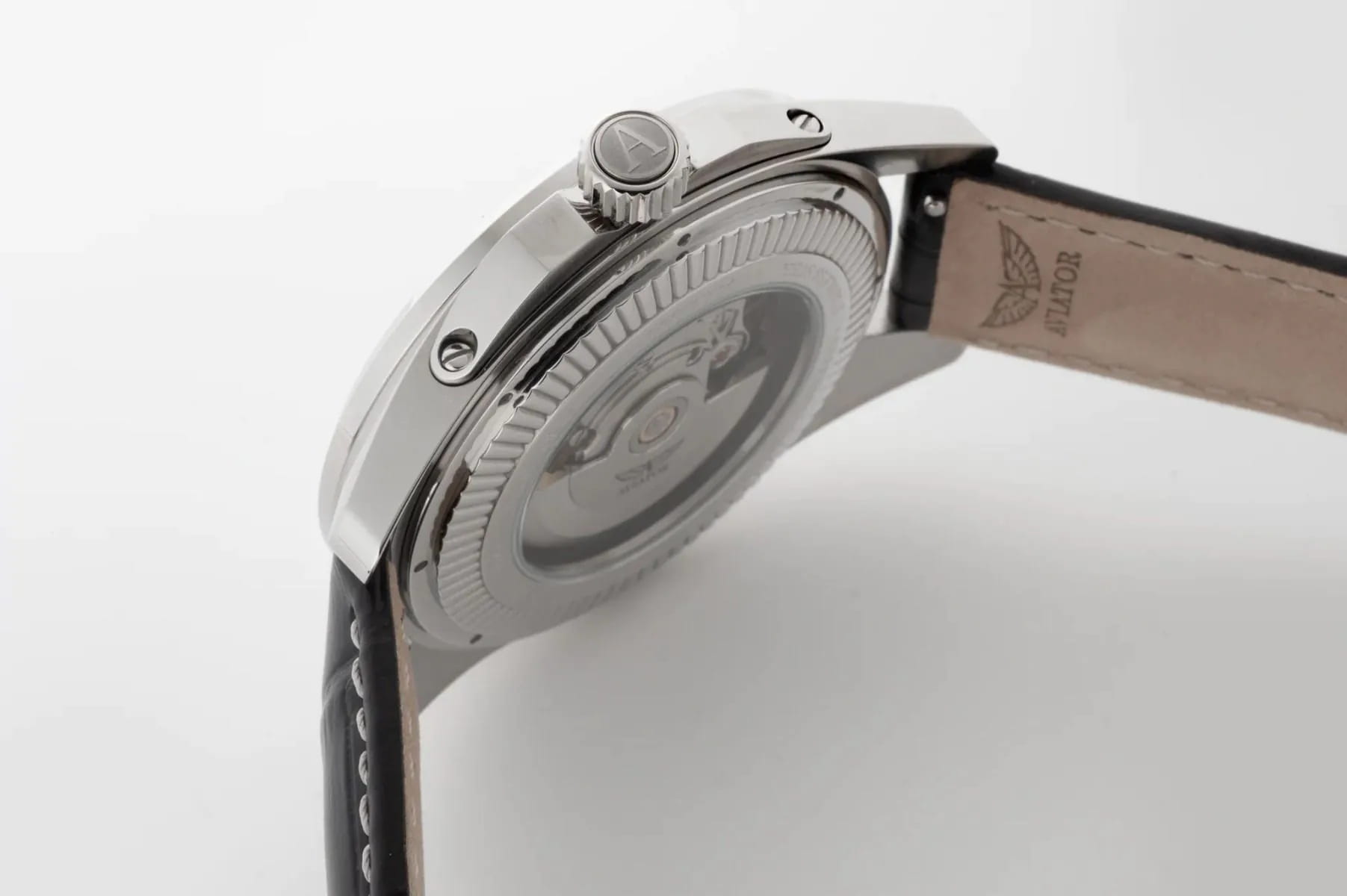 Aviator Airacobra V.3.39.0.337.4 — швейцарские часы в классике авиадизайна, сочетающие безупречную читаемость и высокую надёжность. Корпус диаметром 42,8 мм выполнен из нержавеющей стали 316L. Матовый циферблат с крупными арабскими цифрами, широкими стрелками и контрастной шкалой минут обеспечивает точную и быструю считываемость информации — как и положено настоящим пилотским часам. У отметки «3 часа» — окошко даты. Часовые метки и стрелки покрыты люминесцентным покрытиемЛюминесцентное покрытиеПозволяет считывать показания времени в темноте. Производители наносят на стрелки, часовые индексы, безель или поверхность циферблата светонакопительный состав, дающий холодное свечение. Superluminova, позволяющим легко определять время даже в тёмное время суток. Поверхность защищена прочным сапфировым стекломСапфировое стеклоПрочный и надёжный материал из кристалла сапфира синтетического происхождения, характеризующийся особой твёрдостью и устойчивостью к царапинам и повреждениям. с антибликовым покрытием, устойчивым к царапинам. Сердце модели — швейцарский механизм Sellita SW 200-1, известный своей точностью и долговечностью. Водозащита 100 метров, позволит плавать, нырять и заниматься другими водными видами спорта. Завинчивающаяся головка и задняя крышка обеспечивают уверенную ударопрочностьУдаропрочный корпусМеханизм заключён в корпус, выполненный из современных материалов, устойчивых к ударам, механическим повреждениям и падению с высоты: инновационный пластик, карбон, нержавеющая сталь, титан. и надёжную защиту от влаги и пыли. В механизме 26 камней, запас хода до 38 часов. Модель дополнена кожаным ремешком с выразительной текстурой и классическим стилем, закреплённым с помощью стандартной застежки — для максимального комфорта и лёгкости в повседневном использовании. Aviator — это образец лётной точности, инженерной чёткости и сдержанной роскоши, идеально подходящий для тех, кто ценит функциональность и уверенность в каждом элементе.