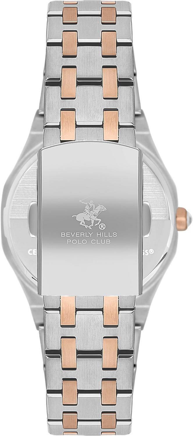 Женские наручные часы Beverly Hills Polo Club Quartz BP3631X.530 с надёжным кварцевым механизмом. Минеральное стеклоМинеральное стеклоМинеральное стекло представляет собой искусственно выращенный минерал кварца. Такое стекло отличается особой устойчивостью к повреждениям и царапинам. Уступает по некоторым качествам сапфировому стеклу. устойчивое к мелким механическим повреждениям. Корпус часов изготовлен из стали. БезельБезельВнешний ободок, закрепляющий стекло. В спортивных часах так называется поворотное кольцо с делениями на циферблате, выполняет роль таймера – замеряет отрезки времени на шкале. Неподвижный безель – элемент декора. Однонаправленно вращающийся безель на дайверских часах позволяет фиксировать моменты погружения и выныривания на поверхность. с IP-покрытиемIP-покрытиеМетод ионного напыления. Демонстрирует повышенную устойчивость к истиранию, окислению и химическим веществам. Под воздействием высокого давления и температуры около 1500°C молекулы металла надёжно соединяются с частицами корпуса часов.. Класс водозащиты: 50 метров, позволит защитить корпус от случайных брызг или капель дождя. Стальной браслет с частичным IP-покрытиемIP-покрытиеМетод ионного напыления. Демонстрирует повышенную устойчивость к истиранию, окислению и химическим веществам. Под воздействием высокого давления и температуры около 1500°C молекулы металла надёжно соединяются с частицами корпуса часов. на раскладной застёжкеРаскладная застёжкаТакой тип застёжки используется только на браслетах из металла. Она никогда не раскрывается полностью, происходит разделение на 2 и более частей. Раскладывающая застёжка снизит вероятность потери часов к минимуму..