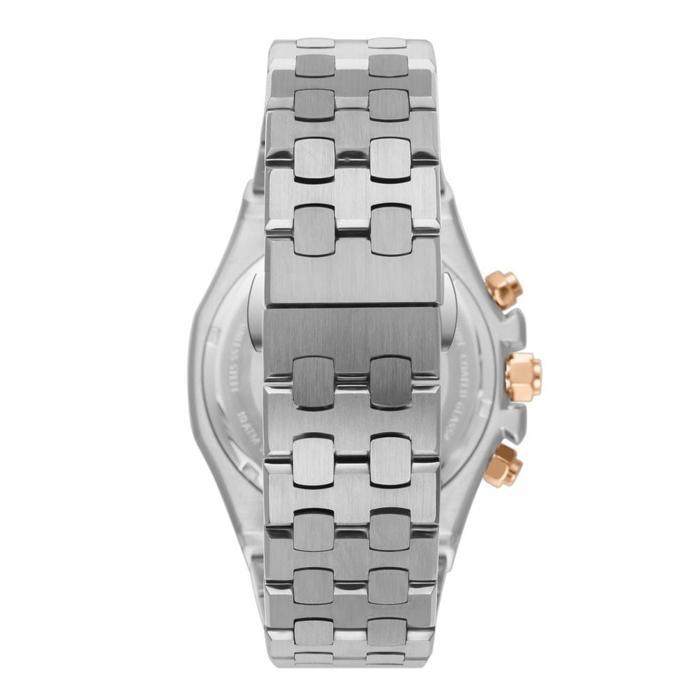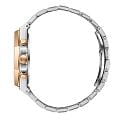 Браслет из стали завершён застёжкой-бабочкой с кнопкамиЗастёжка "бабочка"Такой вид застёжки дополняется предохранителями, помогающими избежать случайного раскрытия браслета. Обладают изящным исполнением. — с кнопочным механизмом для удобного снятия. Водозащита до 50 м удовлетворит потребности как делового, так и активного образа жизни .