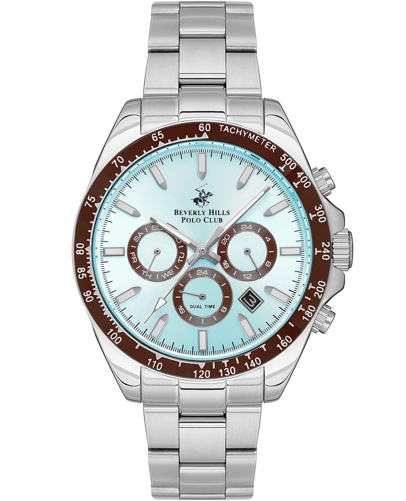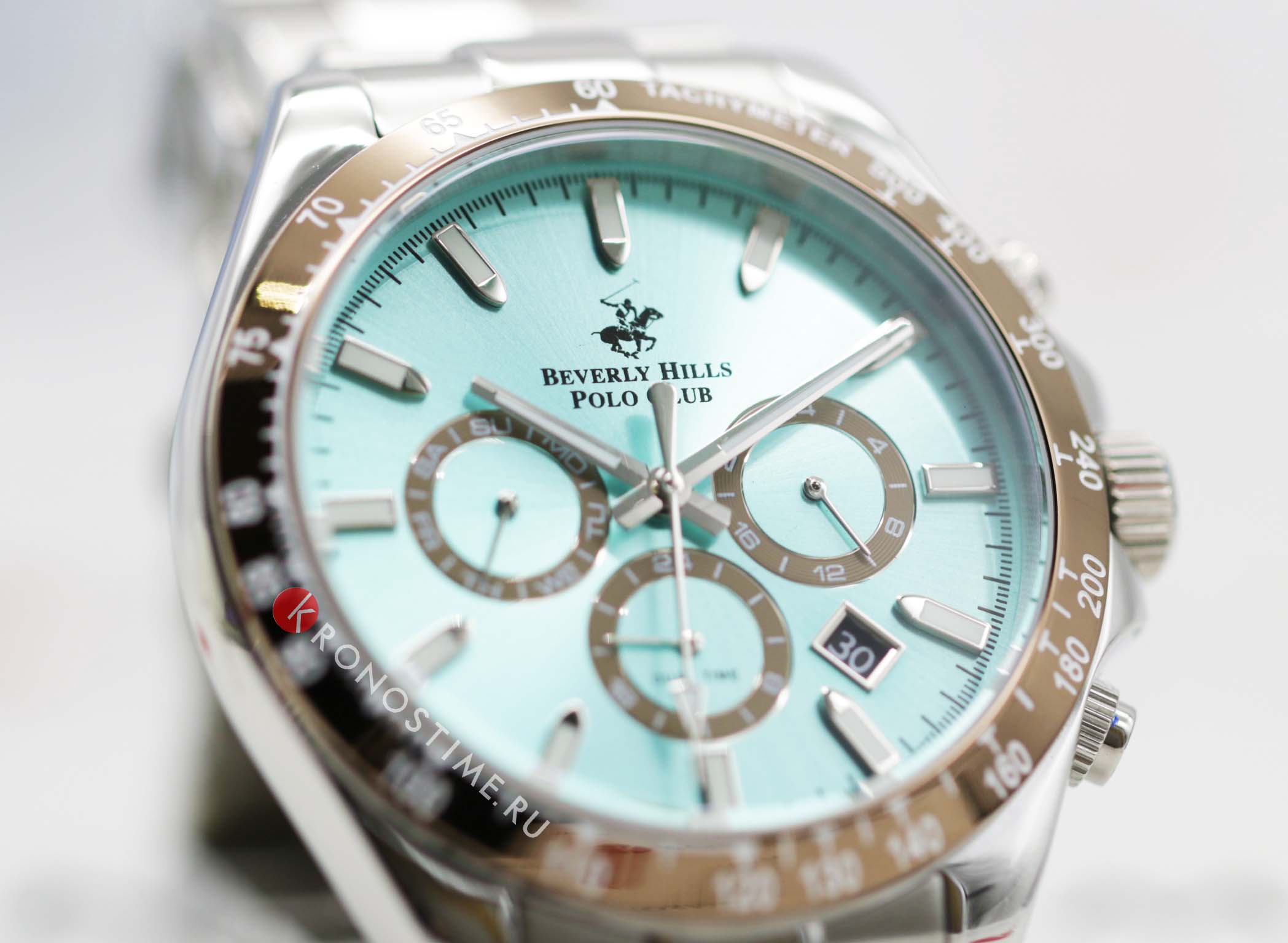 Американские мужские часы Beverly Hills Polo Club BP3127X.301 с минеральным стекломМинеральное стеклоМинеральное стекло представляет собой искусственно выращенный минерал кварца. Такое стекло отличается особой устойчивостью к повреждениям и царапинам. Уступает по некоторым качествам сапфировому стеклу.. Кварцевый механизм высокой точности. Корпус и браслет часов изготовлены из нержавеющей стали. Стрелки и метки с люминесцентным покрытиемЛюминесцентное покрытиеПозволяет считывать показания времени в темноте. Производители наносят на стрелки, часовые индексы, безель или поверхность циферблата светонакопительный состав, дающий холодное свечение.. Окошко даты находится в положении между 4 и 5 часов. Стальной браслет на раскладной застёжкеРаскладная застёжкаТакой тип застёжки используется только на браслетах из металла. Она никогда не раскрывается полностью, происходит разделение на 2 и более частей. Раскладывающая застёжка снизит вероятность потери часов к минимуму.. Класс водозащиты: 50 метров, позволит защитить корпус от случайных брызг или капель дождя. День недели, 24-х часовой формат времени и второй часовой поясВторой часовой поясФункция, позволяющая отображать время двух часовых поясов одновременно. отображены на дополнительных циферблатах. БезельБезельВнешний ободок, закрепляющий стекло. В спортивных часах так называется поворотное кольцо с делениями на циферблате, выполняет роль таймера – замеряет отрезки времени на шкале. Неподвижный безель – элемент декора. Однонаправленно вращающийся безель на дайверских часах позволяет фиксировать моменты погружения и выныривания на поверхность. с IP-покрытиемIP-покрытиеМетод ионного напыления. Демонстрирует повышенную устойчивость к истиранию, окислению и химическим веществам. Под воздействием высокого давления и температуры около 1500°C молекулы металла надёжно соединяются с частицами корпуса часов. и шкалой тахиметраТахиметрРазмеченная шкала, располагается на ободке или безеле часов. Тахиметр позволяет рассчитать скорость на определённом участке пути, расстояние измеряется в километрах или милях..