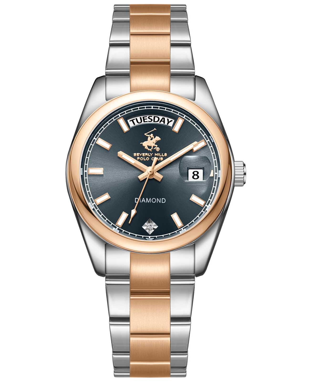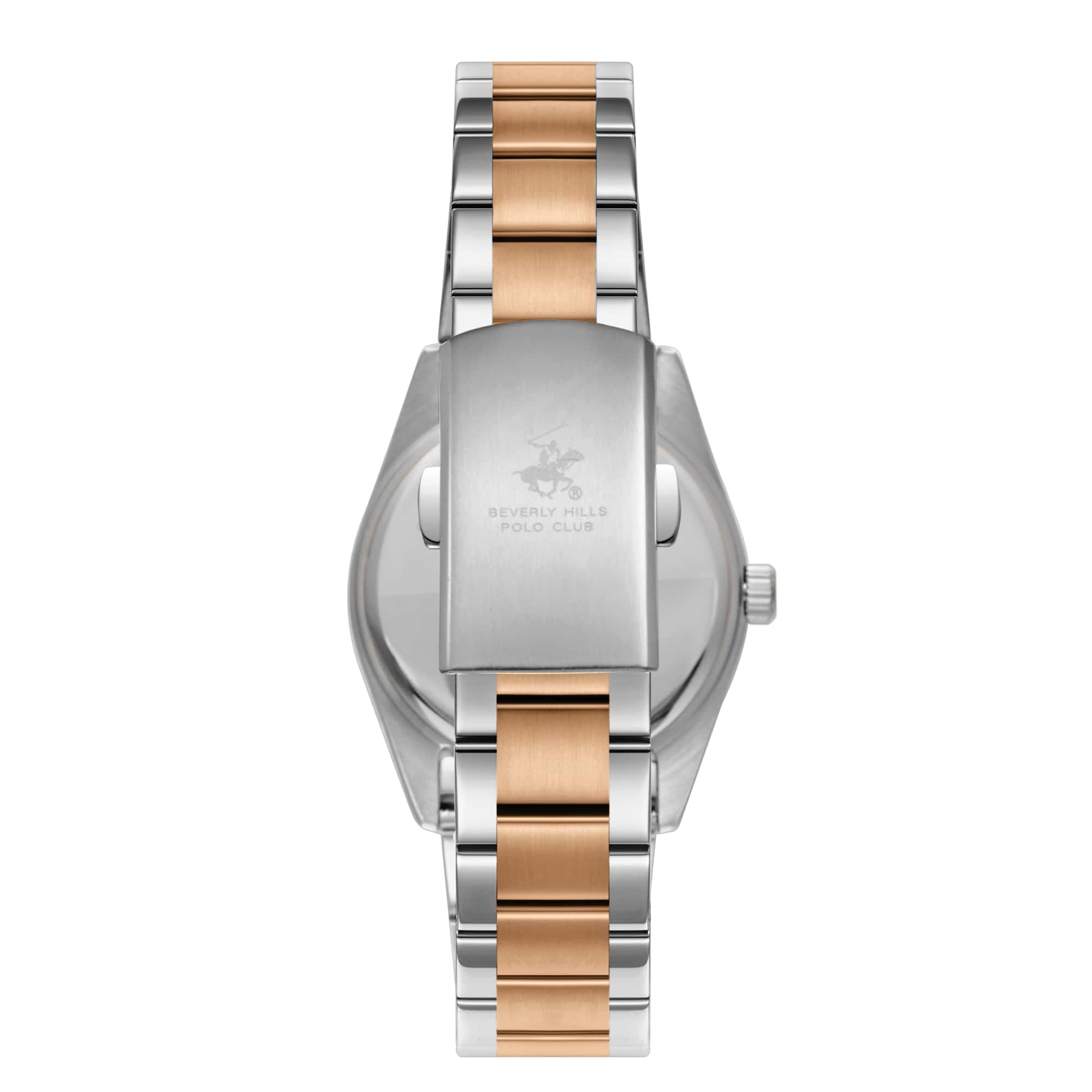 Beverly Hills Polo Club BP3709X.590 – элегантные женские часы, сочетающие стильный дизайн и высокую функциональность. Корпус диаметром 34 мм выполнен из стали, обеспечивающего прочность и долговечность. Циферблат украшен синтетическим бриллиантом, придающим модели роскошный вид, и защищён минеральным стекломМинеральное стеклоМинеральное стекло представляет собой искусственно выращенный минерал кварца. Такое стекло отличается особой устойчивостью к повреждениям и царапинам. Уступает по некоторым качествам сапфировому стеклу., устойчивым к царапинам. БезельБезельВнешний ободок, закрепляющий стекло. В спортивных часах так называется поворотное кольцо с делениями на циферблате, выполняет роль таймера – замеряет отрезки времени на шкале. Неподвижный безель – элемент декора. Однонаправленно вращающийся безель на дайверских часах позволяет фиксировать моменты погружения и выныривания на поверхность. с PVD-покрытиемPVDУльтратонкое покрытие наносится в технике вакуумного напыления, сочетает в себе нитрид титана особой прочности со слоем золота или оксида хрома. Несёт в себе декоративную или защитную функцию.. Часы оснащены точным кварцевым механизмом, гарантирующим надёжное отображение времени. Браслет из нержавеющей стали с PVD-покрытиемPVDУльтратонкое покрытие наносится в технике вакуумного напыления, сочетает в себе нитрид титана особой прочности со слоем золота или оксида хрома. Несёт в себе декоративную или защитную функцию. оснащён раскладной застёжкойРаскладная застёжкаТакой тип застёжки используется только на браслетах из металла. Она никогда не раскрывается полностью, происходит разделение на 2 и более частей. Раскладывающая застёжка снизит вероятность потери часов к минимуму., обеспечивающей комфортное ношение и надёжную фиксацию на запястье. Водозащита до 50 метров (5 ATM) позволяет использовать часы в повседневной жизни, включая кратковременное погружение в воду.