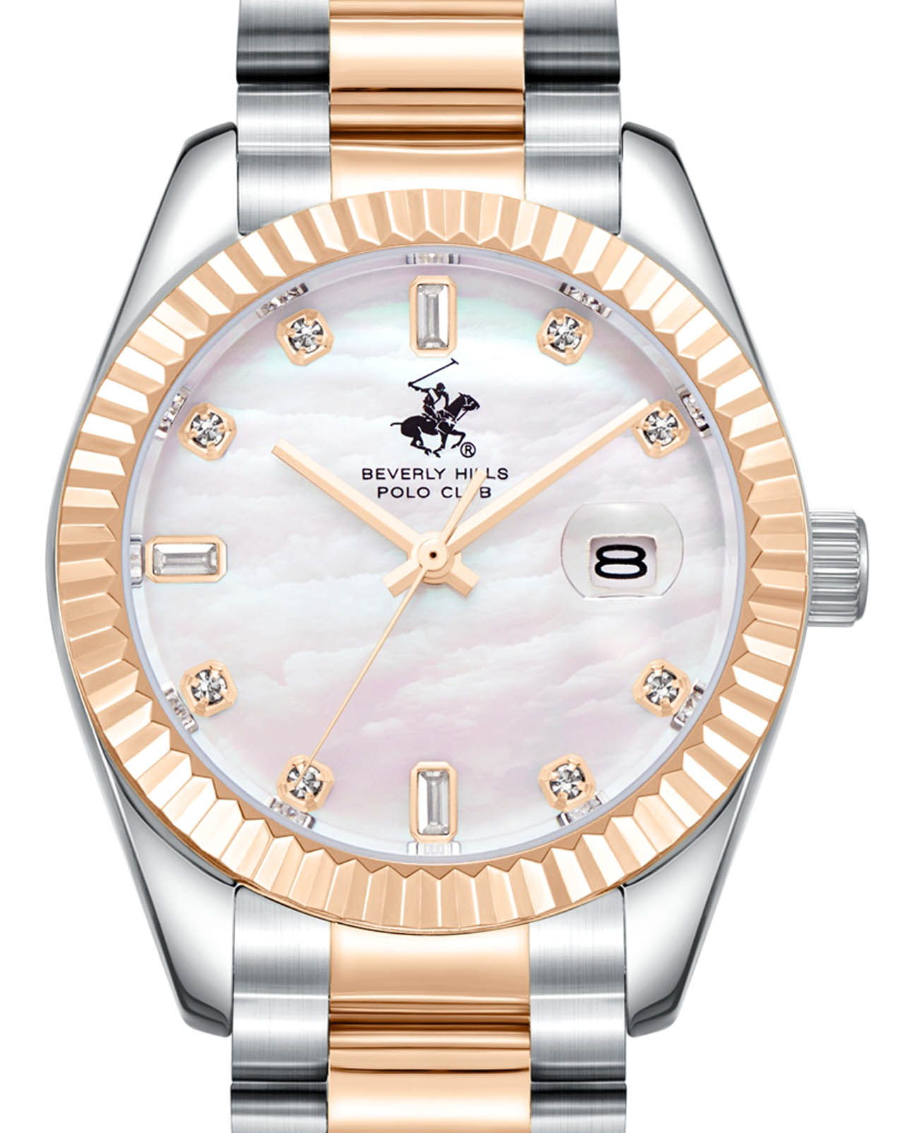 Американские женские часы Beverly Hills Polo Club BP3801X.520 - это стильный женский аксессуар, который сочетает элегантный дизайн и практичность. Корпус выполнен из нержавеющей стали серебристого цвета, диаметром 32 мм, что обеспечивает долговечность и утончённый внешний вид. Надежное минеральное стеклоМинеральное стеклоМинеральное стекло представляет собой искусственно выращенный минерал кварца. Такое стекло отличается особой устойчивостью к повреждениям и царапинам. Уступает по некоторым качествам сапфировому стеклу. с сапфировым покрытием защищает циферблат от царапин и обеспечивает долговечность. Неподвижный рифленый безельБезельВнешний ободок, закрепляющий стекло. В спортивных часах так называется поворотное кольцо с делениями на циферблате, выполняет роль таймера – замеряет отрезки времени на шкале. Неподвижный безель – элемент декора. Однонаправленно вращающийся безель на дайверских часах позволяет фиксировать моменты погружения и выныривания на поверхность. с IP-покрытиемIP-покрытиеМетод ионного напыления. Демонстрирует повышенную устойчивость к истиранию, окислению и химическим веществам. Под воздействием высокого давления и температуры около 1500°C молекулы металла надёжно соединяются с частицами корпуса часов. цвета розового золота. Метки инкрустированы цирконами. Модель оснащена кварцевым механизмом, обеспечивающим высокую точность хода. Стальной браслет с частичным IP-покрытиемIP-покрытиеМетод ионного напыления. Демонстрирует повышенную устойчивость к истиранию, окислению и химическим веществам. Под воздействием высокого давления и температуры около 1500°C молекулы металла надёжно соединяются с частицами корпуса часов. на раскладной застёжкеРаскладная застёжкаТакой тип застёжки используется только на браслетах из металла. Она никогда не раскрывается полностью, происходит разделение на 2 и более частей. Раскладывающая застёжка снизит вероятность потери часов к минимуму. обеспечивает комфортное ношение. Водозащита 30 метров позволит защитить корпус от случайных брызг или капель дождя. Эта модель – отличный выбор для тех, кто ищет сочетание стиля, качества и функциональности. Часы станут не только полезным аксессуаром, но и выразительным элементом вашего имиджа.