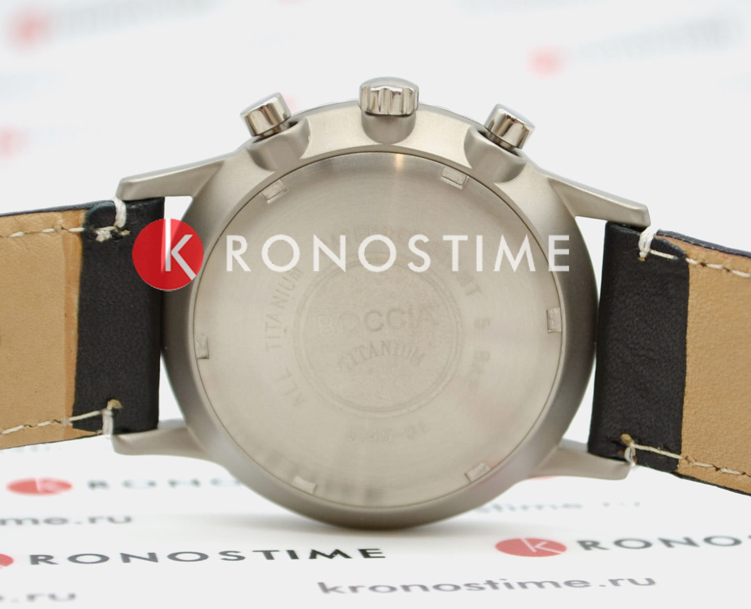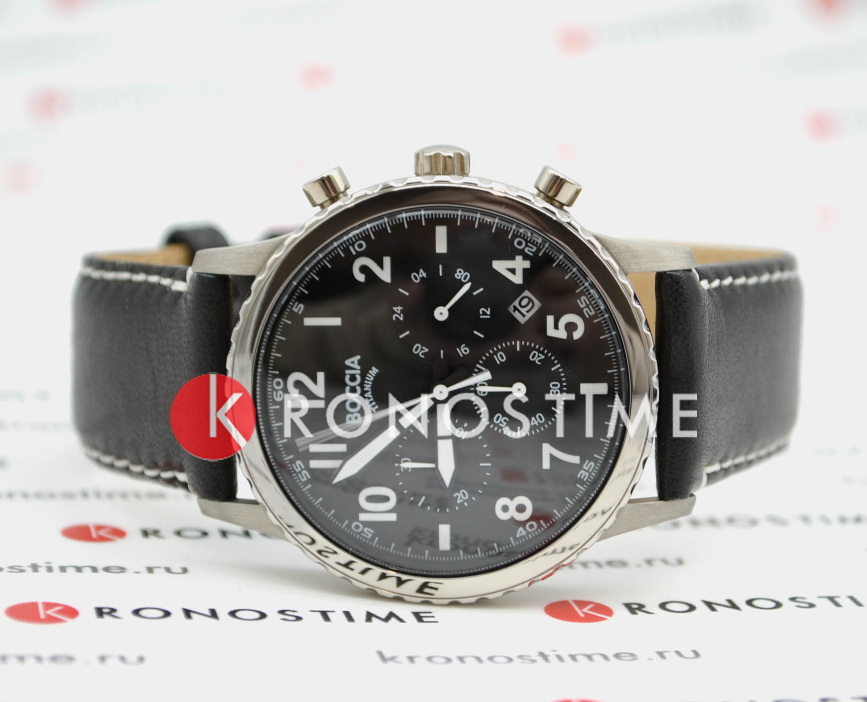Мужские немецкие титановые часы-хронографХронографФункция позволяет измерять отрезки времени с особой точностью: часы, минуты, секунды. Верным признаком хронографа является наличие на циферблате 3 дополнительных окошек-счётчиков. с секундомеромСекундомерСекундоме́р — прибор, способный измерять интервалы времени с точностью до долей секунды. Boccia Titanium Circle-Oval 3745-01, кварцевый механизм с высокой точностью. Сапфировое стеклоСапфировое стеклоПрочный и надёжный материал из кристалла сапфира синтетического происхождения, характеризующийся особой твёрдостью и устойчивостью к царапинам и повреждениям. устойчивое к появлению царапин, обладающее высокой прозрачностью. Корпус изготовлен из титана. На цифрблате расположены три дополнительных индикатора и окошко даты. Стрелки с люминесцентным покрытиемЛюминесцентное покрытиеПозволяет считывать показания времени в темноте. Производители наносят на стрелки, часовые индексы, безель или поверхность циферблата светонакопительный состав, дающий холодное свечение.. Класс водозащиты: 50 метров, позволит защитить корпус от случайных брызг или капель дождя. Кожаный браслет на стандартной застежке.