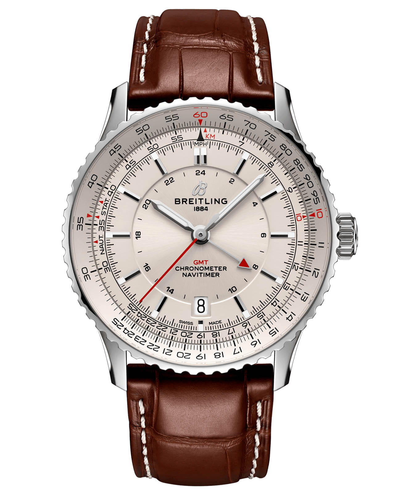 Самые универсальные часы Navitimer от Breitling — для путешествий. Navitimer - одни из самых узнаваемых часов, когда-либо созданных. Они входят в списки величайших часов всех времен по версии коллекционеров. Часы, которые появились в 1952 году как инструмент для пилотов, со временем стали значить нечто очень важное для каждого, кто брал их с собой в путешествие. Модели Navitimer Automatic и GMT 41 с автоподзаводом создают культовый внешний вид, исключая хронограф, но сохраняя сбалансированную композицию циферблата. Центральное расположение 24-часовой шкалы по Гринвичу и чистый циферблат автоматических часов выделяют сложную логарифмическую линейку, подчеркивая общую эстетику. Для придания коллекции более современного вида был добавлен безель с насечкой, а чередующиеся полированные и матовые элементы отделки создают динамичную игру света. Ремешки из кожи аллигатора и браслеты с бесшовной застежкой-бабочкой обеспечивают комфорт и удобство. Палитра включает в себя красочные циферблаты, выполненные из нержавеющей стали.