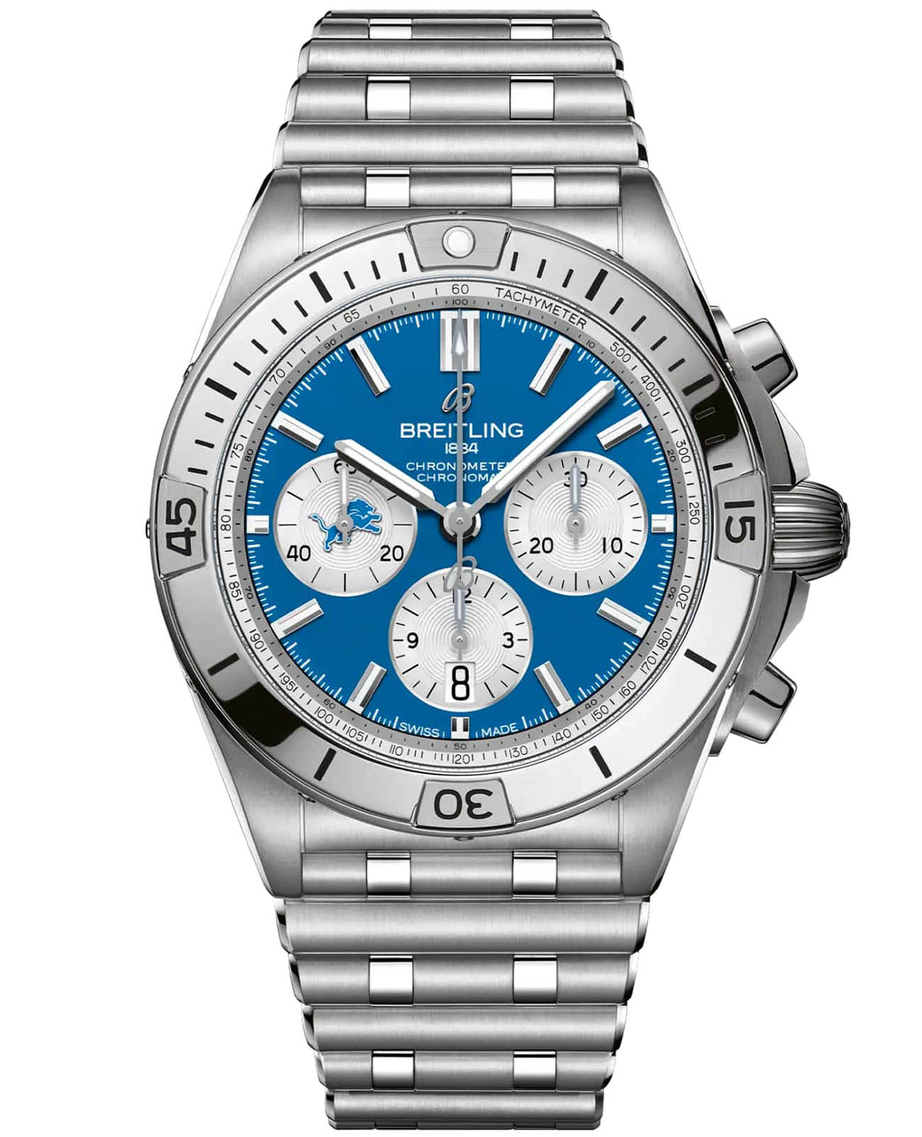 Мужские швейцарские часы-хронограф с секундомером Breitling Chronomat B01 42 NFL Detroit Lions Edition AB01342B1CCA1, механический механизм (автоматический калибр) с высокой точностью. Сапфировое стеклоСапфировое стеклоПрочный и надёжный материал из кристалла сапфира синтетического происхождения, характеризующийся особой твёрдостью и устойчивостью к царапинам и повреждениям. устойчивое к появлению царапин, обладающее высокой прозрачностью. Класс водозащиты: 200 метров, позволит плавать, нырять и заниматься другими водными видами спорта. Корпус часов изготовлен из нержавеющей стали. Стальной браслет на застёжке «бабочка» с кнопкамиЗастёжка "бабочка"Такой вид застёжки дополняется предохранителями, помогающими избежать случайного раскрытия браслета. Обладают изящным исполнением. . Стрелки и метки с люминесцентным покрытиемЛюминесцентное покрытиеПозволяет считывать показания времени в темноте. Производители наносят на стрелки, часовые индексы, безель или поверхность циферблата светонакопительный состав, дающий холодное свечение.. Шкала тахиметра на циферблате. Окошко даты находится в положении 6 часов.