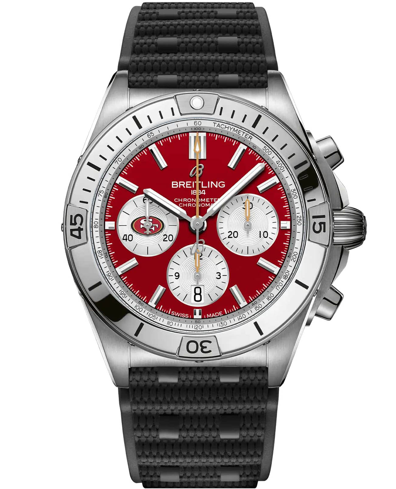 Мужские швейцарские часы-хронограф с секундомером Breitling B01 42 NFL San Francisco 49ers Edition AB01342B1K1S1, механический механизм (автоматический калибр) с высокой точностью. Сапфировое стеклоСапфировое стеклоПрочный и надёжный материал из кристалла сапфира синтетического происхождения, характеризующийся особой твёрдостью и устойчивостью к царапинам и повреждениям. устойчивое к появлению царапин, обладающее высокой прозрачностью. Класс водозащиты: 200 метров, позволит плавать, нырять и заниматься другими водными видами спорта. Корпус часов изготовлен из нержавеющей стали. Браслет из каучука на раскладной застёжкеРаскладная застёжкаТакой тип застёжки используется только на браслетах из металла. Она никогда не раскрывается полностью, происходит разделение на 2 и более частей. Раскладывающая застёжка снизит вероятность потери часов к минимуму.. Стрелки и метки с люминесцентным покрытиемЛюминесцентное покрытиеПозволяет считывать показания времени в темноте. Производители наносят на стрелки, часовые индексы, безель или поверхность циферблата светонакопительный состав, дающий холодное свечение.. Шкала тахиметра на циферблате. Окошко даты находится в положении 6 часов.
