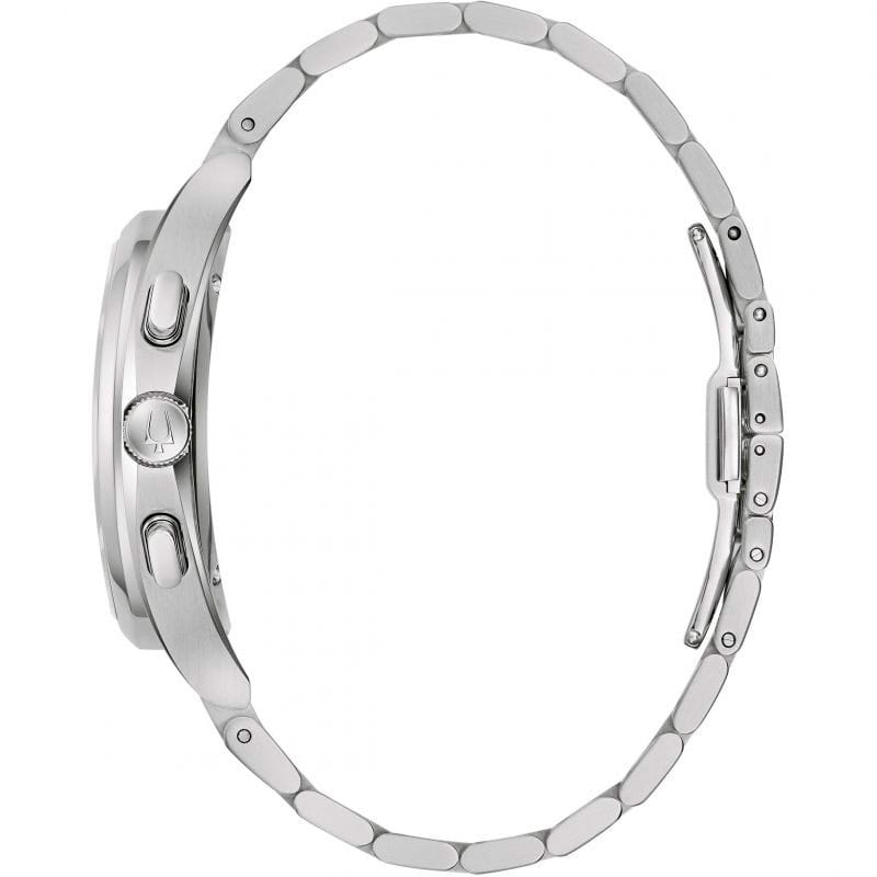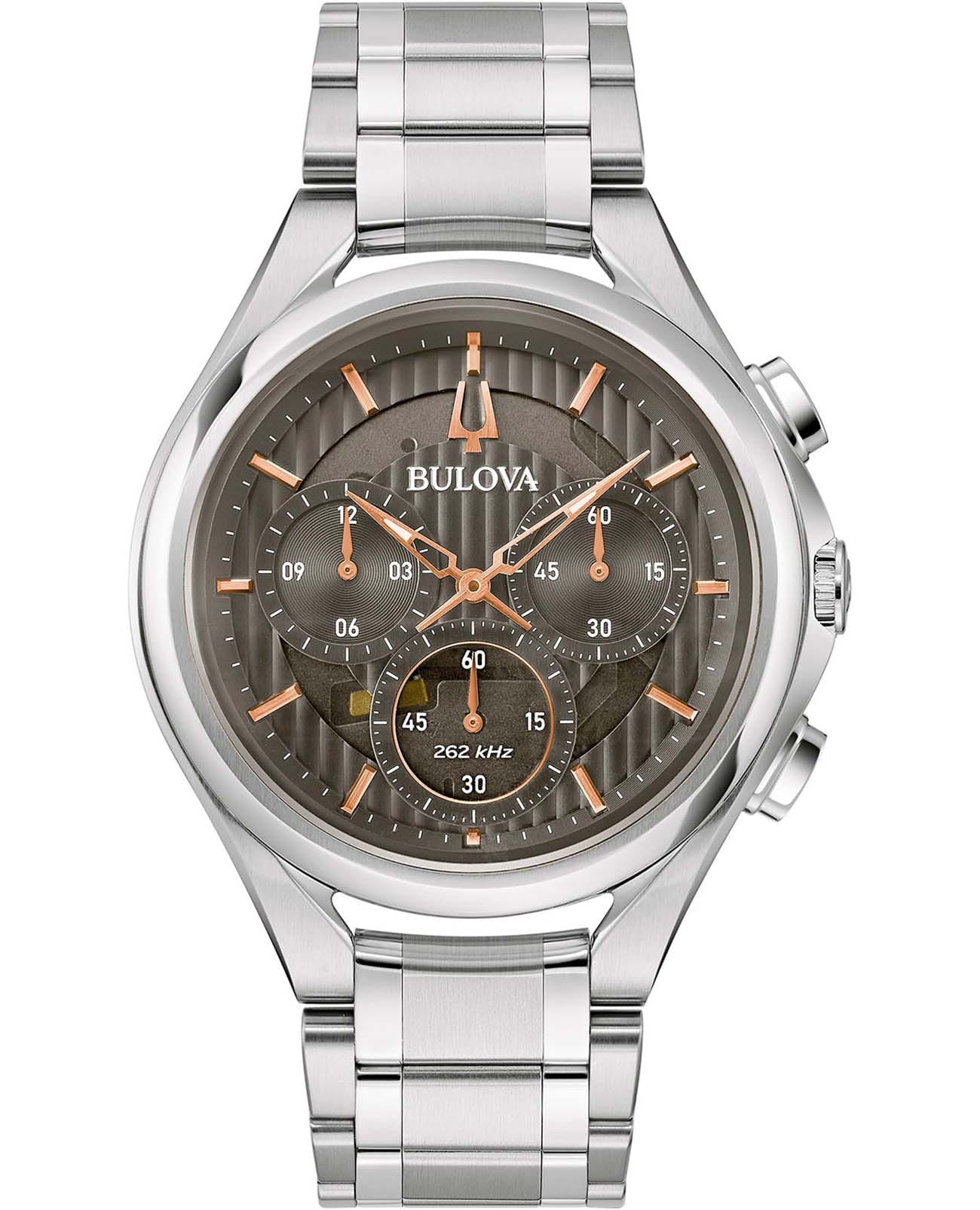 Мужские кварцевые часы-хронографХронографФункция позволяет измерять отрезки времени с особой точностью: часы, минуты, секунды. Верным признаком хронографа является наличие на циферблате 3 дополнительных окошек-счётчиков. Bulova CURV 96A298 – отражающий идеальное сочетание современного дизайна, надёжности и функциональности. Элегантный облик станет превосходным завершением образа, наделив его индивидуальным характером. Корпус из нержавеющей стали серебристого цвета, диаметром 44 мм идеально сбалансирован и элегантен. Защиту циферблата обеспечивает прочное сапфировое стеклоСапфировое стеклоПрочный и надёжный материал из кристалла сапфира синтетического происхождения, характеризующийся особой твёрдостью и устойчивостью к царапинам и повреждениям. с антибликовым покрытиемАнтибликовое покрытиеСлой оксида металла в 0,13-0,3 микрон, благодаря которому стекло часов не бликует и не отражает свет. Антибликовое покрытие уменьшает отражение света в 10 раз, обеспечивая отличную читаемость показателей циферблата. гарантирующее четкость показаний. Центральные часовая и минутная стрелки, секундная стрелка вынесена на малый циферблат. Стальной браслет на застёжке-бабочке с кнопкамиЗастёжка "бабочка"Такой вид застёжки дополняется предохранителями, помогающими избежать случайного раскрытия браслета. Обладают изящным исполнением. обеспечивает комфортное ношение. Водозащита 30 метров позволит защитить корпус от случайных брызг или капель дождя. Стрелки с люминесцентным покрытиемЛюминесцентное покрытиеПозволяет считывать показания времени в темноте. Производители наносят на стрелки, часовые индексы, безель или поверхность циферблата светонакопительный состав, дающий холодное свечение. позволяющие легко определять время даже в темноте. Эта модель – отличный выбор для тех, кто ищет сочетание стиля, качества и функциональности. Часы станут не только полезным аксессуаром, но и выразительным элементом вашего имиджа.
