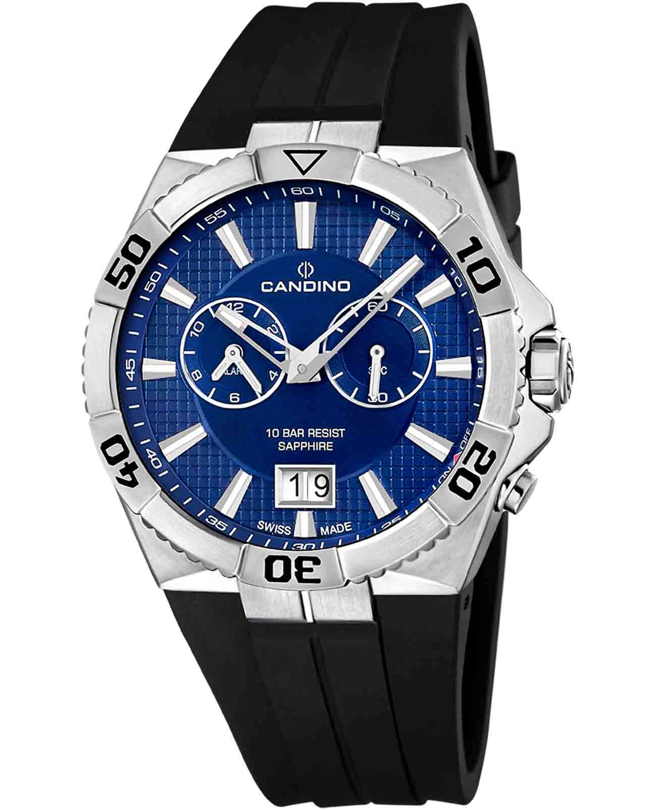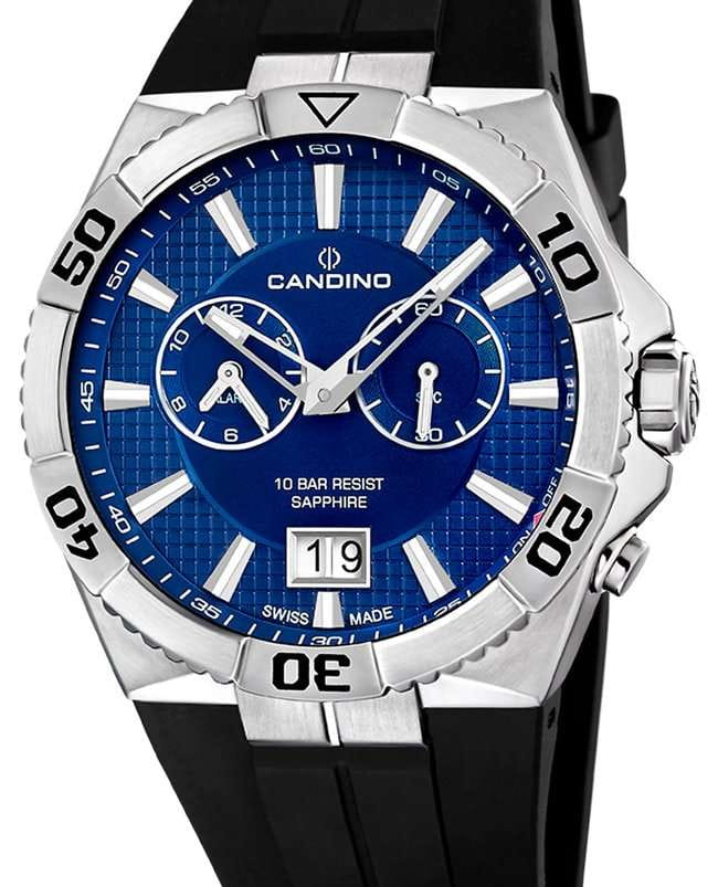 Мужские наручные часы Candino C4449/A из коллекции Sportive сочетают в себе спортивный дизайн и надежность швейцарского качества. Модель обладает круглым корпусом, изготовленным из нержавеющей стали, что обеспечивает высокую устойчивость к внешним воздействиям . Ремешок выполнен из каучука с классической застежкой, гарантирующей комфортное ношение и безопасность . Синий циферблат дополнен окном даты и оснащен люминесцентными стрелками и меткамиЛюминесцентное покрытиеПозволяет считывать показания времени в темноте. Производители наносят на стрелки, часовые индексы, безель или поверхность циферблата светонакопительный состав, дающий холодное свечение., обеспечивающими отличную видимость в темноте . Для защиты используется сапфировое стеклоСапфировое стеклоПрочный и надёжный материал из кристалла сапфира синтетического происхождения, характеризующийся особой твёрдостью и устойчивостью к царапинам и повреждениям., которое обеспечивает прочную защиту от царапин и антибликовый эффект . Часы работают на кварцевом механизме, что гарантирует точное время без необходимости подзаводки . Водонепроницаемость модели достигает 100 метров (10 атмосфер), что позволяет использовать их во время плавания и других водных видов спорта.