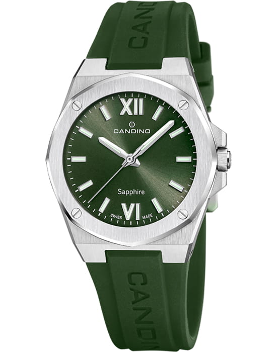 Женские швейцарские часы с сапфировым стекломСапфировое стеклоПрочный и надёжный материал из кристалла сапфира синтетического происхождения, характеризующийся особой твёрдостью и устойчивостью к царапинам и повреждениям. Candino Quartz C4777/4, кварцевый механизм с высокой точностью. Сапфировое стеклоСапфировое стеклоПрочный и надёжный материал из кристалла сапфира синтетического происхождения, характеризующийся особой твёрдостью и устойчивостью к царапинам и повреждениям. устойчивое к появлению царапин, обладающее высокой прозрачностью. Класс водозащиты: 100 метров, позволит плавать, нырять и заниматься другими водными видами спорта. Корпус часов изготовлен из стали. Каучуковый ремешок на стандартной застежке. Стрелки с люминесцентным покрытиемЛюминесцентное покрытиеПозволяет считывать показания времени в темноте. Производители наносят на стрелки, часовые индексы, безель или поверхность циферблата светонакопительный состав, дающий холодное свечение..