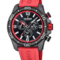 Корпус часов изготовлен из карбона, что придаёт им прочность и долговечность. Класс водозащиты 100 метров позволяет носить часы в условиях активного водного спорта, включая плавание, ныряние и другие водные виды спорта. Каучуковый ремешок на стандартной застёжке обеспечивает комфортное и надёжное крепление на запяте. Стрелки и метки с люминесцентным покрытиемЛюминесцентное покрытиеПозволяет считывать показания времени в темноте. Производители наносят на стрелки, часовые индексы, безель или поверхность циферблата светонакопительный состав, дающий холодное свечение.. Окошко даты находится в положении 6 часов.
