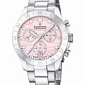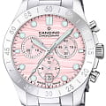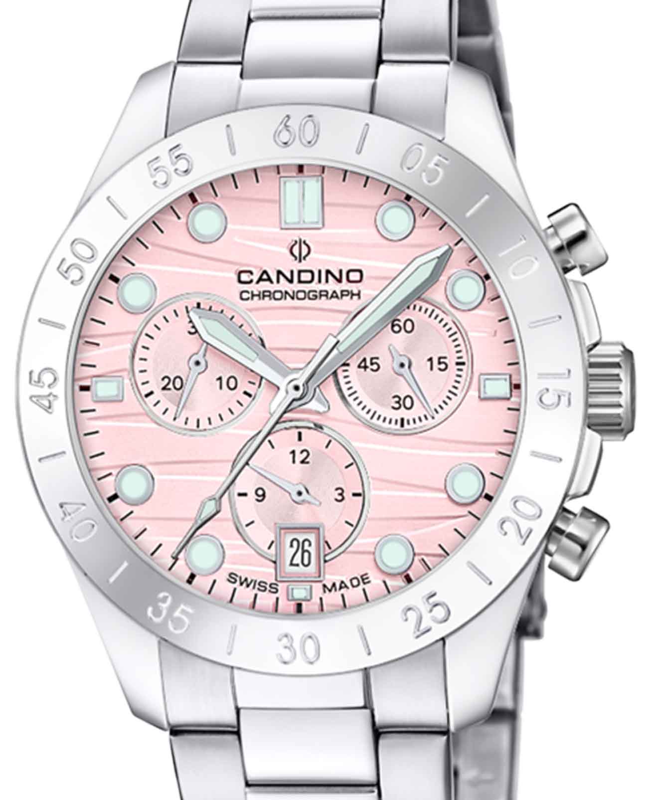 Женские часы Candino Chronos C4783/2 — сочетание элегантности и функциональности для современных женщин. Эти стильные часы-хронографХронографФункция позволяет измерять отрезки времени с особой точностью: часы, минуты, секунды. Верным признаком хронографа является наличие на циферблате 3 дополнительных окошек-счётчиков. с секундомеромСекундомерСекундоме́р — прибор, способный измерять интервалы времени с точностью до долей секунды. оснащены кварцевым механизмом, обеспечивающим точность и надежность. На безелеБезельВнешний ободок, закрепляющий стекло. В спортивных часах так называется поворотное кольцо с делениями на циферблате, выполняет роль таймера – замеряет отрезки времени на шкале. Неподвижный безель – элемент декора. Однонаправленно вращающийся безель на дайверских часах позволяет фиксировать моменты погружения и выныривания на поверхность. выгравирована секундная шкала. Розовый циферблат с функцией отображения даты в районе 6 часов добавляет модели изысканности и позволяет легко отслеживать дату. Корпус диаметром 39 мм выполнен из прочной нержавеющей стали, что гарантирует долговечность и устойчивость к внешним воздействиям. Сапфировое стеклоСапфировое стеклоПрочный и надёжный материал из кристалла сапфира синтетического происхождения, характеризующийся особой твёрдостью и устойчивостью к царапинам и повреждениям. защищает циферблат, обеспечивая высокую степень защиты от царапин и сохраняя первозданный вид часов. Стрелки и метки с люминесцентным покрытиемЛюминесцентное покрытиеПозволяет считывать показания времени в темноте. Производители наносят на стрелки, часовые индексы, безель или поверхность циферблата светонакопительный состав, дающий холодное свечение., что облегчает чтение времени даже в условиях слабого освещения. Стальной браслет на раскладной застёжкеРаскладная застёжкаТакой тип застёжки используется только на браслетах из металла. Она никогда не раскрывается полностью, происходит разделение на 2 и более частей. Раскладывающая застёжка снизит вероятность потери часов к минимуму. добавляет современный штрих и комфортно сидит на запястье, идеально подходя для повседневного ношения. С водонепроницаемостью до 100 метров эти часы подходят для активного образа жизни, позволяя не беспокоиться о случайных контактах с водой, таких как плавание или дождь.