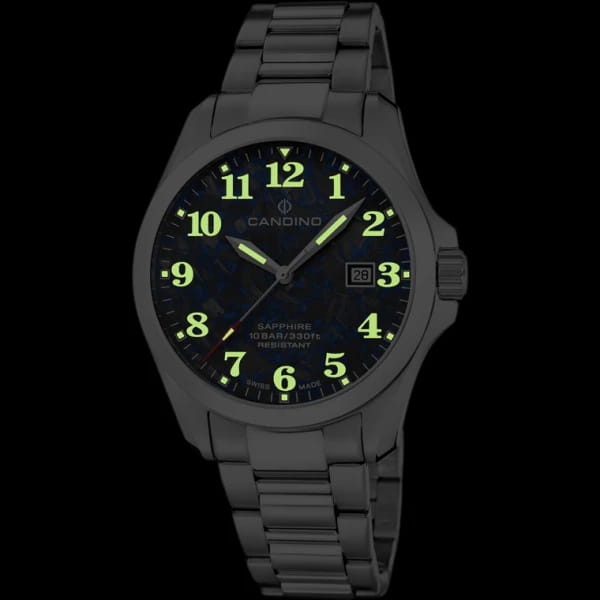 Мужские кварцевые часы Candino C4785/2 — это стильный и надёжный аксессуар швейцарского производства, подчёркивающий индивидуальность и хороший вкус. Корпус круглой формы выполнен из нержавеющей стали и защищён сапфировым стекломСапфировое стеклоПрочный и надёжный материал из кристалла сапфира синтетического происхождения, характеризующийся особой твёрдостью и устойчивостью к царапинам и повреждениям., устойчивым к царапинам. Циферблат оформлен арабскими цифрами, а стрелки и метки оснащены люминесцентным покрытиемЛюминесцентное покрытиеПозволяет считывать показания времени в темноте. Производители наносят на стрелки, часовые индексы, безель или поверхность циферблата светонакопительный состав, дающий холодное свечение., обеспечивающим хорошую читаемость в темноте. Окошко даты расположено на отметке 3 часа, что делает часы не только элегантными, но и функциональными. Часы оснащены стальным браслетом серебристого цвета с раскладной застёжкойРаскладная застёжкаТакой тип застёжки используется только на браслетах из металла. Она никогда не раскрывается полностью, происходит разделение на 2 и более частей. Раскладывающая застёжка снизит вероятность потери часов к минимуму., который обеспечивает комфорт при ношении. Водонепроницаемость 100 м позволяет использовать часы в повседневных условиях, включая плавание. Модель сочетает в себе классический стиль, швейцарское качество и надёжность, оставаясь универсальным выбором для любого случая. В комплекте предусмотрены два ремешка из кожи и текстиля.