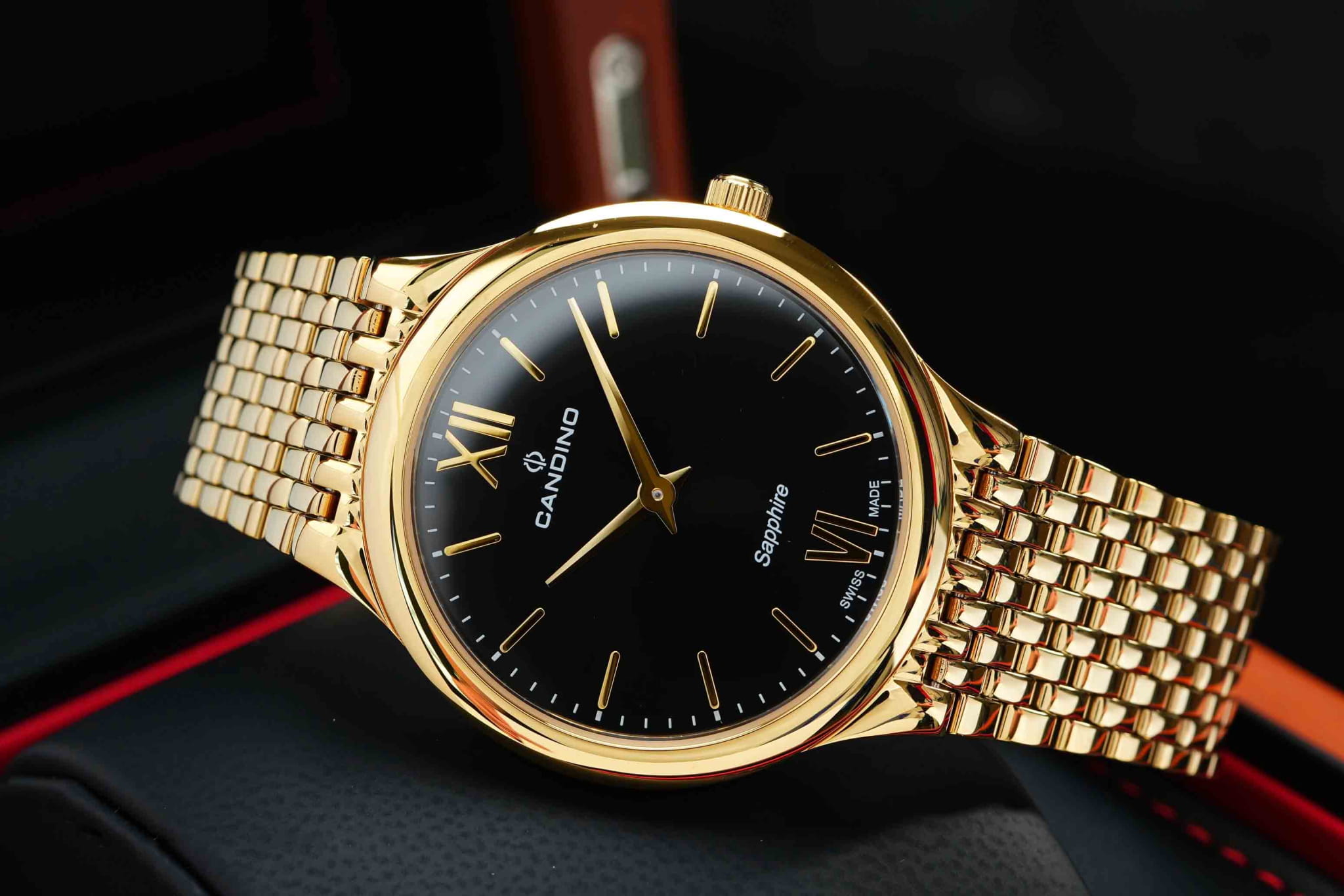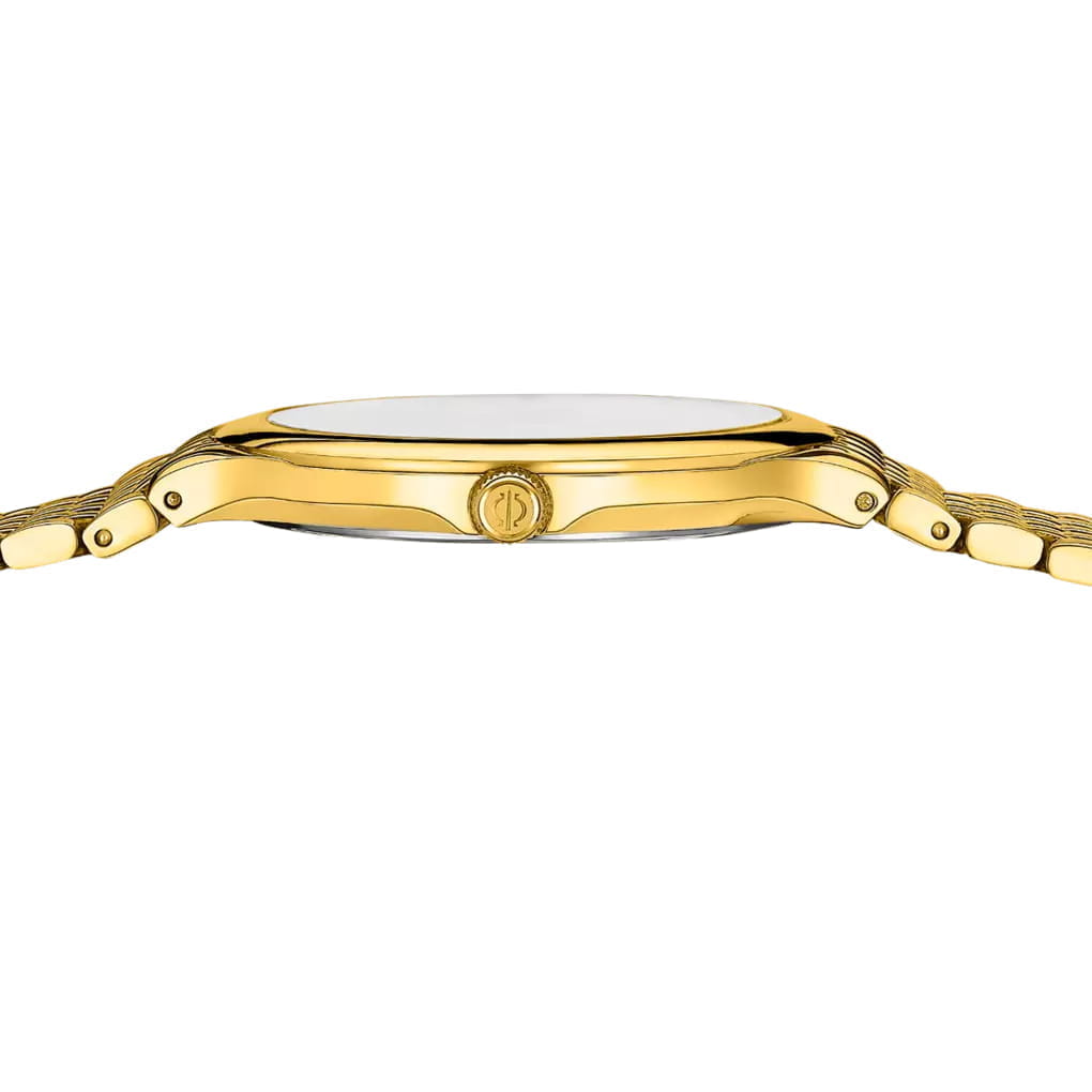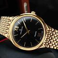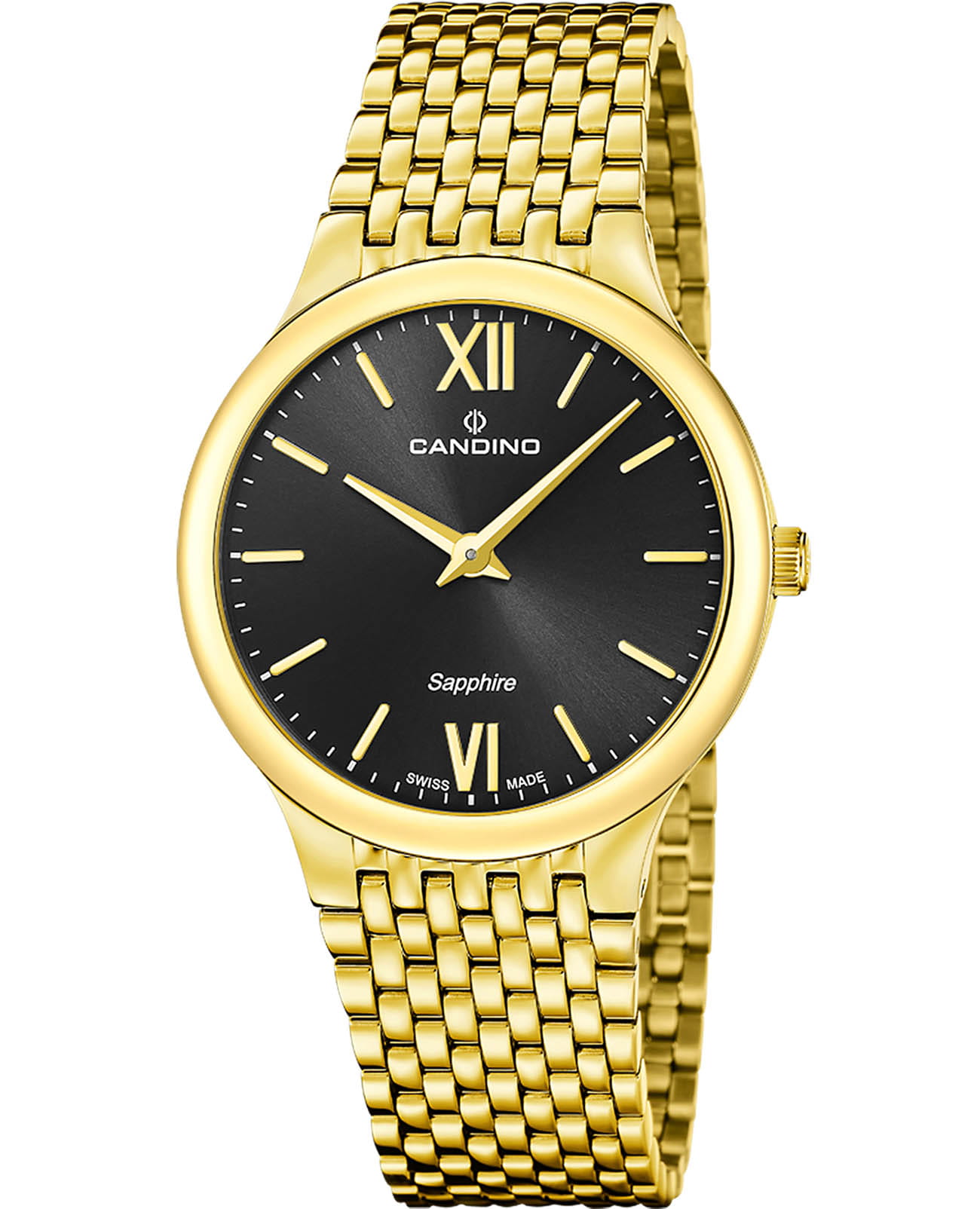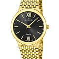 Мужские кварцевые часы Candino из коллекции Series 1947 — это сочетание минимализма, швейцарского качества и современного дизайна. Корпус диаметром 39 мм и толщиной 6 мм выполнен из нержавеющей стали 316L с PVD-покрытиемPVDУльтратонкое покрытие наносится в технике вакуумного напыления, сочетает в себе нитрид титана особой прочности со слоем золота или оксида хрома. Несёт в себе декоративную или защитную функцию. жёлтого золота. Циферблат чёрного цвета оформлен двумя стрелками без индикации даты, что придаёт дизайну чистоту и элегантность. Циферблат защищён сапфировым стекломСапфировое стеклоПрочный и надёжный материал из кристалла сапфира синтетического происхождения, характеризующийся особой твёрдостью и устойчивостью к царапинам и повреждениям., устойчивым к царапинам. Механизм — кварцевый произведённый в Швейцарии. Часы оснащены стальным браслетом с PVD-покрытиемPVDУльтратонкое покрытие наносится в технике вакуумного напыления, сочетает в себе нитрид титана особой прочности со слоем золота или оксида хрома. Несёт в себе декоративную или защитную функцию. жёлтого золота на застёжке «бабочка» с кнопкамиЗастёжка "бабочка"Такой вид застёжки дополняется предохранителями, помогающими избежать случайного раскрытия браслета. Обладают изящным исполнением. . Водонепроницаемость 50 м позволяет использовать часы в повседневных условиях. Гарантия — 2 года. Идеальный выбор для тех, кто ценит лаконичный стиль, точность и надёжность.