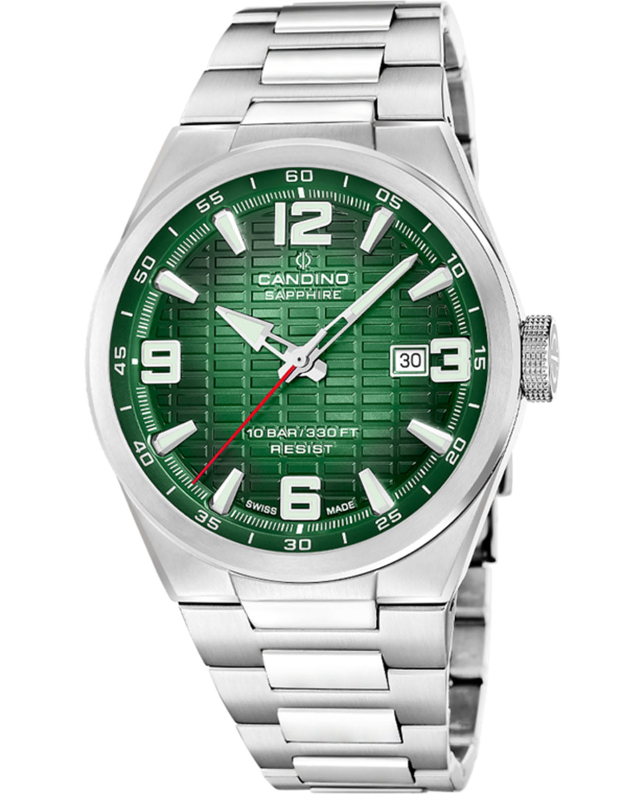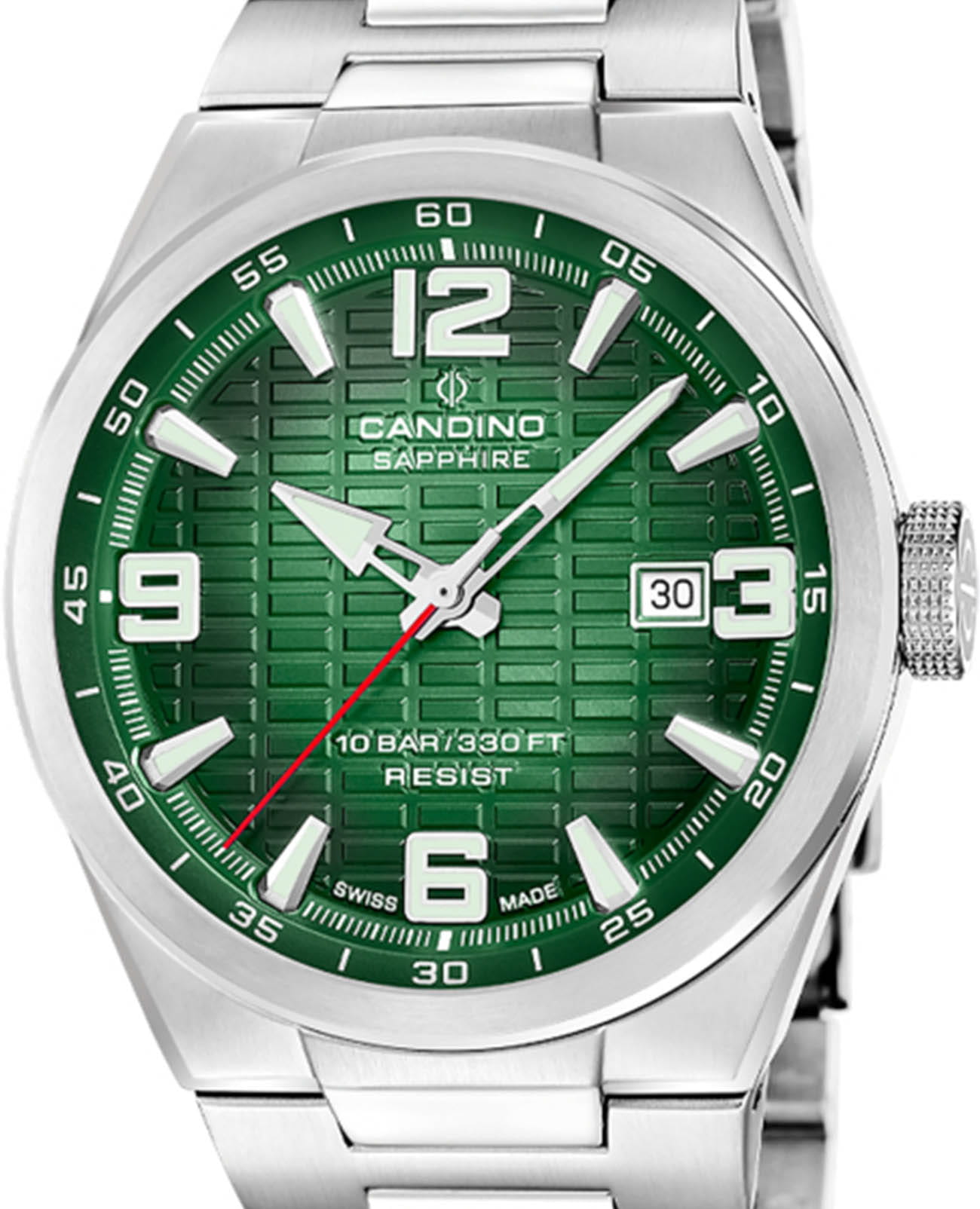 Мужские кварцевые часы Candino из коллекции Series 1947 — это сочетание классического дизайна, надёжности и швейцарского качества. Корпус диаметром 43 мм выполнен из нержавеющей стали. Циферблат зелёного цвета оформлен индексами и стрелками с люминесцентным покрытиемЛюминесцентное покрытиеПозволяет считывать показания времени в темноте. Производители наносят на стрелки, часовые индексы, безель или поверхность циферблата светонакопительный состав, дающий холодное свечение.. Окошко даты расположено в положении 3 часов. Циферблат защищён сапфировым стекломСапфировое стеклоПрочный и надёжный материал из кристалла сапфира синтетического происхождения, характеризующийся особой твёрдостью и устойчивостью к царапинам и повреждениям., устойчивым к царапинам. Механизм — кварцевый, обеспечивает высокую точность хода. Часы оснащены стальным браслетом с раскладной застёжкойРаскладная застёжкаТакой тип застёжки используется только на браслетах из металла. Она никогда не раскрывается полностью, происходит разделение на 2 и более частей. Раскладывающая застёжка снизит вероятность потери часов к минимуму.. Водонепроницаемость 100 м позволяет использовать часы для плавания и повседневного ношения. Гарантия — 2 года. Идеальный выбор для тех, кто ценит стиль, точность и надёжность.