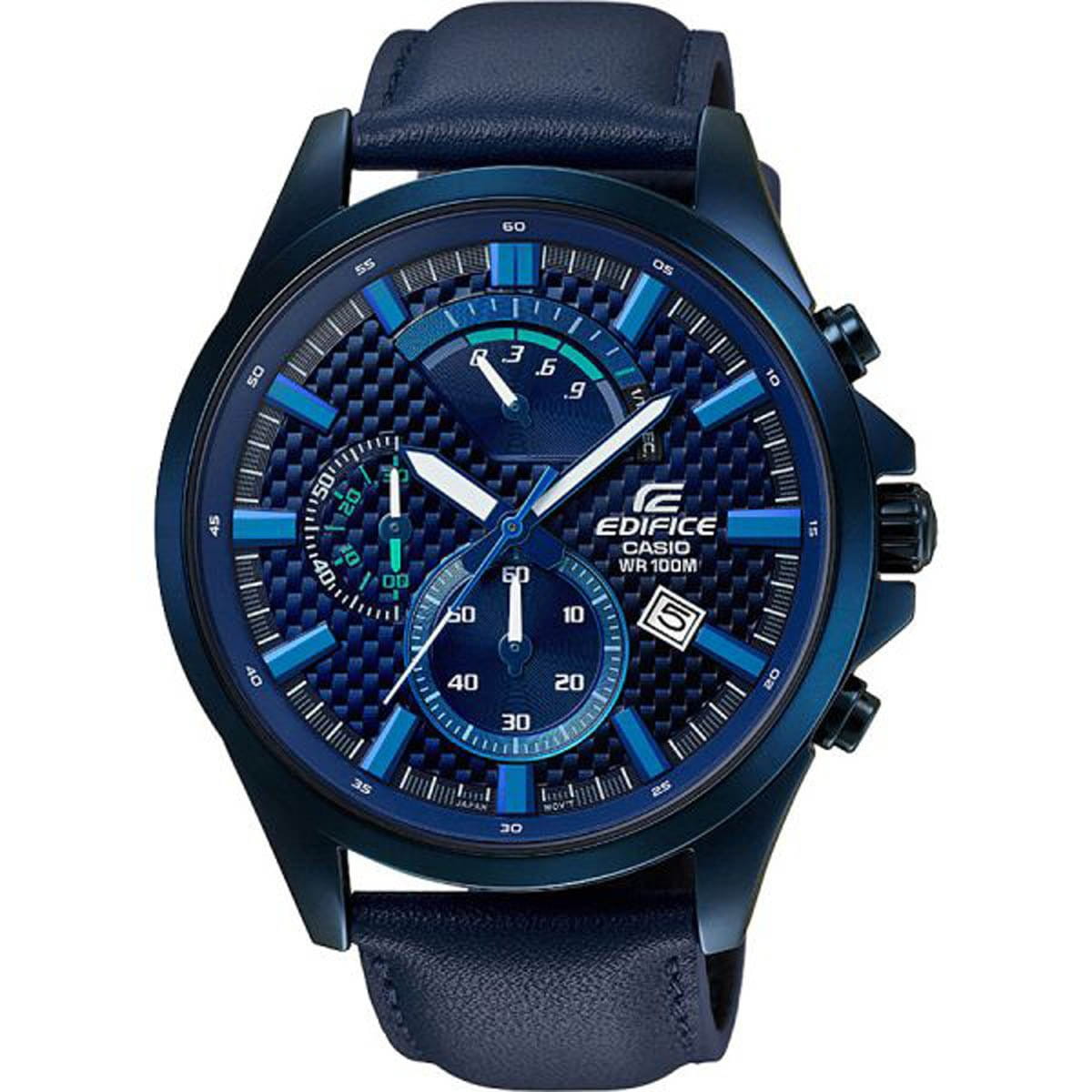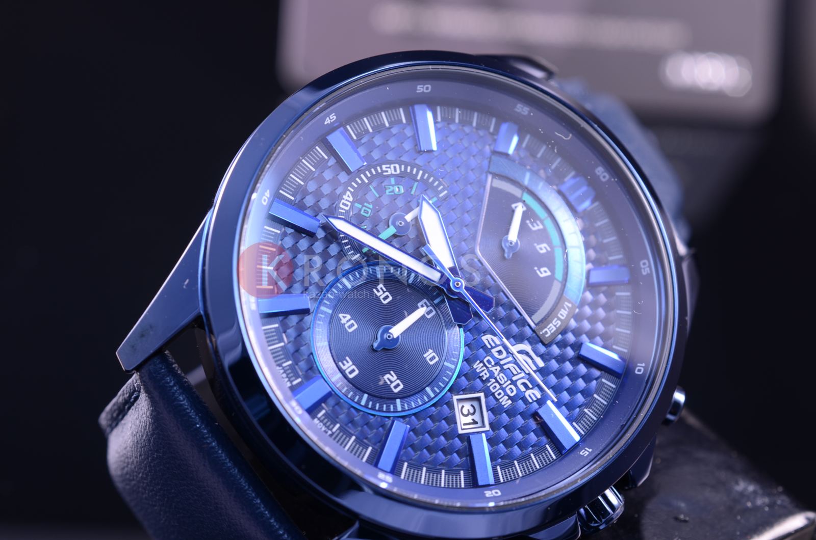 Casio выпускает пополнение у часов-хронографов EFV-530 с секундомером,задней крышкой с винтовым фиксатором,раскладывающейся застежкой, расстегиваемой одним касанием. Полностью голубые часы имеют кожаный ремешок, а фон циферблата выполнен в карбоновой текстуре, которую так любят использовать в тюннинге автомобилей. Часы водонепроницаемы до 100 Бар, имеют секундомер и отображают дату.