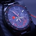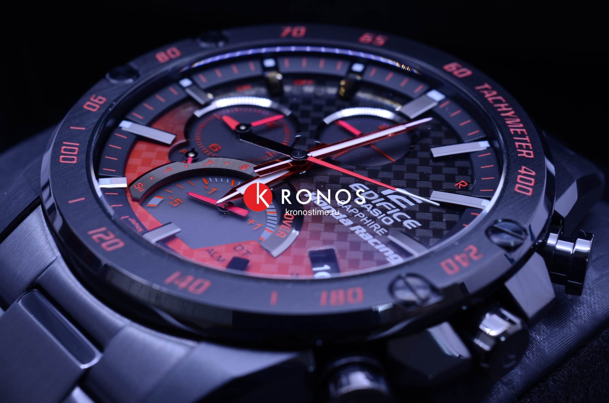 Чёрно-красный градиент навевает мысли о моменте зажигания искрой топлива в цилиндре двигателя, шахматный узор напоминает стартовый флаг. Корпус и браслет имеют ионное IP-покрытие, повышающее долговечность материала. Технология BluetoothBluetoothСовременная технология, позволяющая синхронизировать часы с телефоном и переносить данные. Часы с Bluetooth расширяют возможности вашего смартфона и делают его использование ещё более удобным. позволяет синхронизировать данные со смартфоном. Ультратонкий корпус 8,9 мм. Индикатор заряда батареи. Люминесцентная подсветкаЛюминесцентное покрытиеПозволяет считывать показания времени в темноте. Производители наносят на стрелки, часовые индексы, безель или поверхность циферблата светонакопительный состав, дающий холодное свечение.. Водонепроницаемость при давлении 10 бар. Стекло с антибликовым покрытием. ХронографХронографФункция позволяет измерять отрезки времени с особой точностью: часы, минуты, секунды. Верным признаком хронографа является наличие на циферблате 3 дополнительных окошек-счётчиков., секундомер, индикация числа, будильник, мировое времяМировое время Полезное часовое усложнение, отображающее время в основных городах и известных областях по всему миру, оно связано с часовыми поясами, удобно для путешественников и бизнесменов. . Габариты: 49,9 x 45,6 x 8,9 мм.