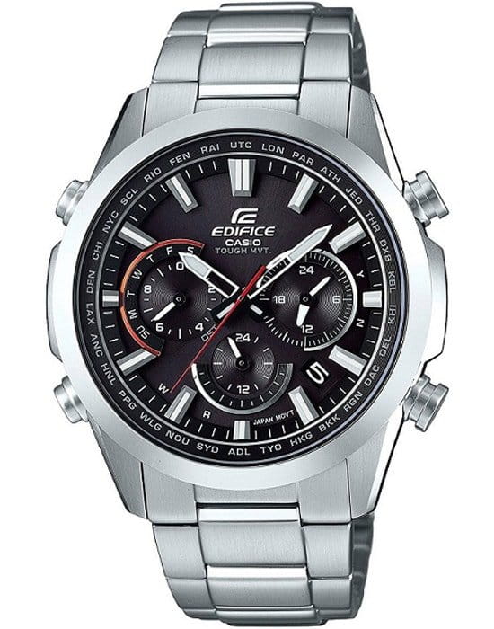 Питание от солнечной энергии Tough Solar - солнечные батарейки большой мощности, индикатор заряда батареи. Функция автоматического сохранения энергии. Время работы аккумулятора без подзарядки приблизительно 5 месяцев, при включенной функции сохранения энергии приблизительно 26 месяцев. Коррекция текущего времени радиосигналом на территории почти всей Европы, США, Японии и Китая. Мировое время – 48 городов (31 часовой пояс), всемирное координированное время (UTC). Функция включения/отключения летнего времени. Cекундомером с точностью показаний 1/20с и временем измерения 24x. Сплит-хронограф. Ретроградный указатель дня недели. Раскладывающаяся застежка, расстегиваемая одним касанием.