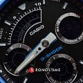 Компактный аксессуар имеет противоударный корпусУдаропрочный корпусМеханизм заключён в корпус, выполненный из современных материалов, устойчивых к ударам, механическим повреждениям и падению с высоты: инновационный пластик, карбон, нержавеющая сталь, титан. из полимерного материала, способного выдерживать падения с высоты и повреждения. Привлекательно смотрится безельБезельВнешний ободок, закрепляющий стекло. В спортивных часах так называется поворотное кольцо с делениями на циферблате, выполняет роль таймера – замеряет отрезки времени на шкале. Неподвижный безель – элемент декора. Однонаправленно вращающийся безель на дайверских часах позволяет фиксировать моменты погружения и выныривания на поверхность. из нержавеющей стали 316L с синим IP-покрытиемIP-покрытиеМетод ионного напыления. Демонстрирует повышенную устойчивость к истиранию, окислению и химическим веществам. Под воздействием высокого давления и температуры около 1500°C молекулы металла надёжно соединяются с частицами корпуса часов.. Аналого-цифровые часы работают от батарейки, рассчитанной на 3 года безупречной эксплуатации. Минеральное стекло. Автоматическая светодиодная подсветкаСветодиодная подсветкаСветодиодная или LED-подсветка обеспечивает появление яркого холодного свечения за счёт LED-элементов - маленьких лампочек. Они потребляют минимальное количество энергии, чаще всего можно встретить 1 светодиод, в нижней части циферблата. дисплея, стрелки и метки с люминесцентным покрытиемЛюминесцентное покрытиеПозволяет считывать показания времени в темноте. Производители наносят на стрелки, часовые индексы, безель или поверхность циферблата светонакопительный состав, дающий холодное свечение.. 12/24-часовое отображение времени. Надёжный полимерный ремешок. Водостойкость 200 метров. Дополнительные возможности: таймер, будильник, мировое времяМировое время Полезное часовое усложнение, отображающее время в основных городах и известных областях по всему миру, оно связано с часовыми поясами, удобно для путешественников и бизнесменов. , секундомер, автоматический календарь. Габариты: 46,4 x 52 x 14,9 мм.