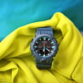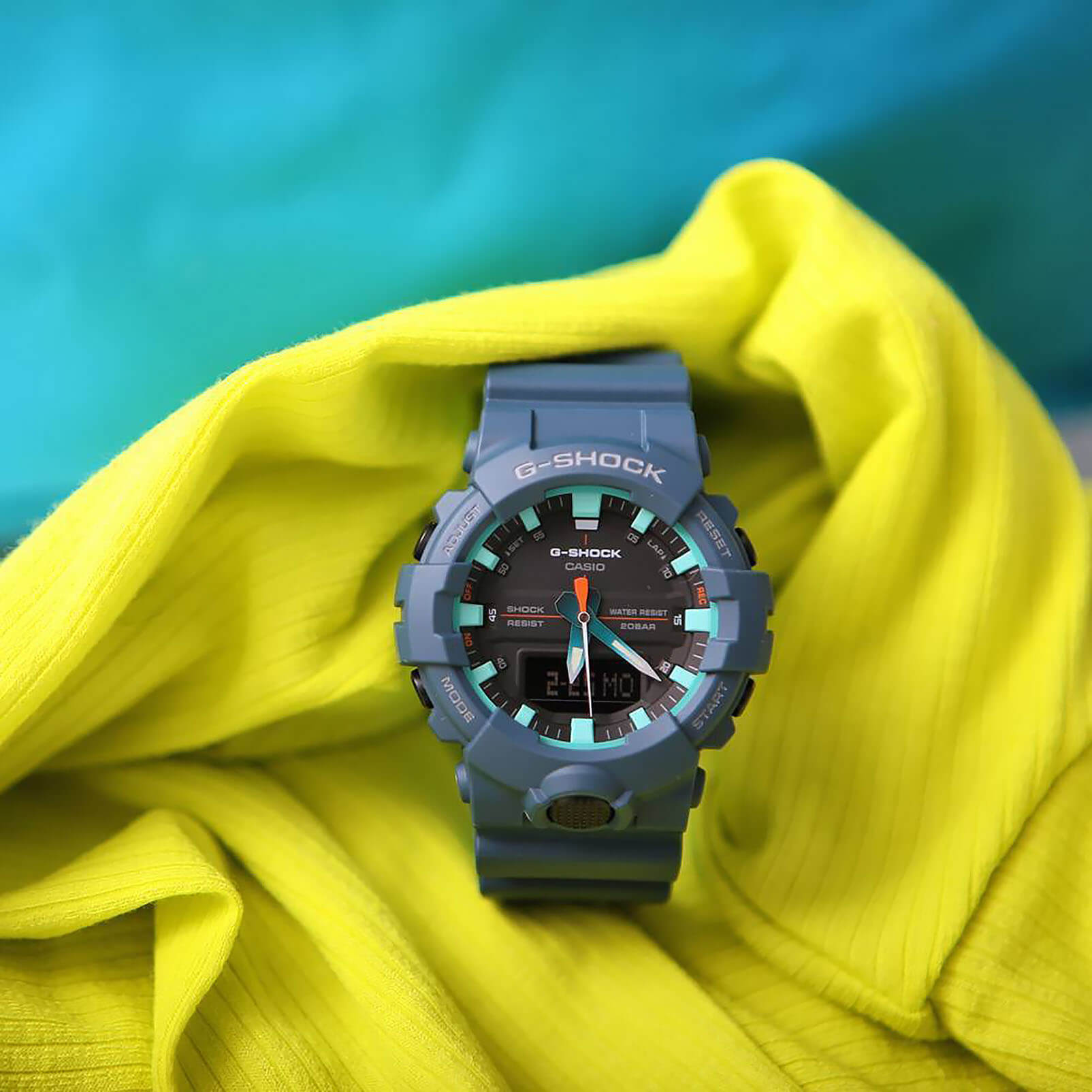 Брендовая модель с бирюзовыми деталями точно станет запоминающейся деталью вашего образа. Часы получили обновлённый дизайн и уменьшенный противоударный корпусУдаропрочный корпусМеханизм заключён в корпус, выполненный из современных материалов, устойчивых к ударам, механическим повреждениям и падению с высоты: инновационный пластик, карбон, нержавеющая сталь, титан., если сравнивать с моделями серии GA-700. Он выполнен из полимерного пластика, что гарантирует повышенную устойчивость к ударам, повреждениям, падению с высоты. Японский кварцевый калибр с точностью хода +/- 15 секунд в месяц. Срок службы батарейки - 3 года. Функция выключения и включения звука кнопок. Стрелки с люминесцентным покрытиемЛюминесцентное покрытиеПозволяет считывать показания времени в темноте. Производители наносят на стрелки, часовые индексы, безель или поверхность циферблата светонакопительный состав, дающий холодное свечение.. Двойная светодиодная подсветкаСветодиодная подсветкаСветодиодная или LED-подсветка обеспечивает появление яркого холодного свечения за счёт LED-элементов - маленьких лампочек. Они потребляют минимальное количество энергии, чаще всего можно встретить 1 светодиод, в нижней части циферблата.. Водозащита 20 бар. Минеральное стекло. Полимерный браслет. Секундомер, таймер обратного отсчёта, мировое времяМировое время Полезное часовое усложнение, отображающее время в основных городах и известных областях по всему миру, оно связано с часовыми поясами, удобно для путешественников и бизнесменов. , 5 ежедневных будильников, автоматический календарь. Габариты: 54,1 x 48,6 x 15,5 мм.