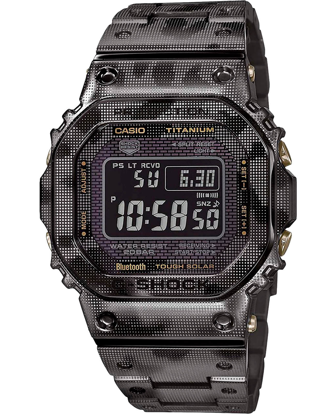 Для наручных часов в необычном «военном» исполнении была использована особая лазерная технология точечного нанесения рисунка. Легендарный 8-угольный ударопрочный корпусУдаропрочный корпусМеханизм заключён в корпус, выполненный из современных материалов, устойчивых к ударам, механическим повреждениям и падению с высоты: инновационный пластик, карбон, нержавеющая сталь, титан. и браслет сделаны из титана, материал отличается устойчивостью к магнитным полям и перепадам температуры, не вызывает аллергии даже на чувствительной коже. Поверхность имеет DLC-покрытиеDLC-покрытиеDiamond like carbon - одно из лучших видов покрытия, представляющее собой углерод с алмазными свойствами. На поверхность материала наносятся распавшиеся молекулы углерода, превращающиеся в плёнку из алмазоподобных связей, которая перенимает твёрдость алмаза., защищающее от царапин и повреждений. Для полной ударопрочности конструкции дополнительно применили слой материала Alpha Gel®. Технология , индикатор состояния заряда батареи. Сапфировое стекло с антибликовым покрытием. Светодиодная подсветкаСветодиодная подсветкаСветодиодная или LED-подсветка обеспечивает появление яркого холодного свечения за счёт LED-элементов - маленьких лампочек. Они потребляют минимальное количество энергии, чаще всего можно встретить 1 светодиод, в нижней части циферблата.. Сохранение водонепроницаемости при давлении до 20 бар. Bluetooth-синхронизация со смартфономBluetoothСовременная технология, позволяющая синхронизировать часы с телефоном и переносить данные. Часы с Bluetooth расширяют возможности вашего смартфона и делают его использование ещё более удобным., функция поиска телефона. Секундомер, таймер, автоматический календарь, мировое времяМировое время Полезное часовое усложнение, отображающее время в основных городах и известных областях по всему миру, оно связано с часовыми поясами, удобно для путешественников и бизнесменов. . Габариты: 43,2 x 49,3 x 13 мм.
