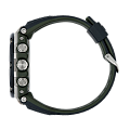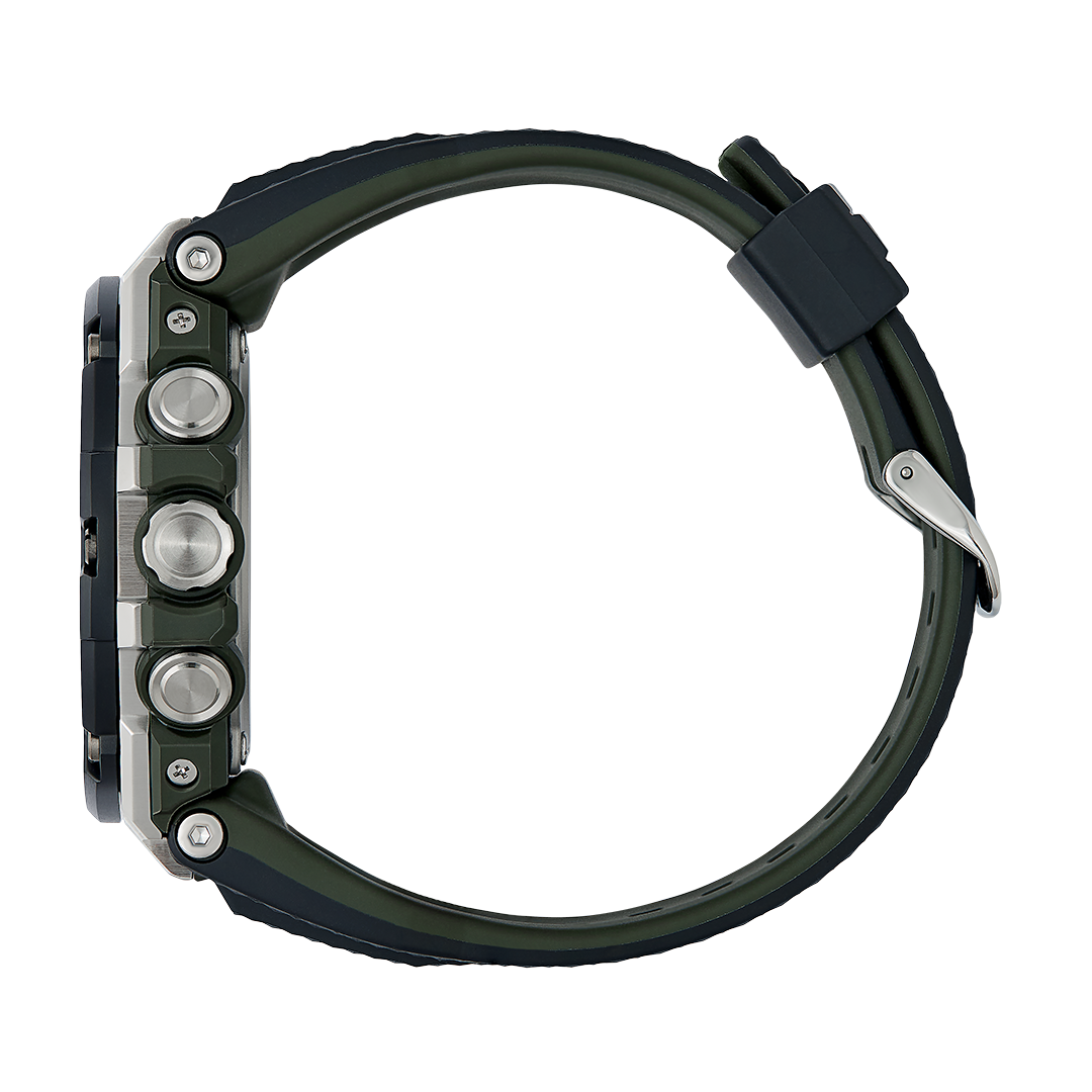 Наручные часы выпущены в брутальном, слегка агрессивном дизайне. Они оформлены в чёрном цвете, ярким элементом стал оранжевый счётчик на метке 9 часов, имитирующий турбину двигателя самолёта. Окошко предназначено для контроля уровня заряда батарейки, чем больше цвета видно, тем выше необходимость поставить часы на подзарядку. Модель серии G-Steel оснащена японским кварцевым механизмом, получаемым энергию для работы от источников света. Так реализуется технология . Аксессуар наделён противоударным корпусомУдаропрочный корпусМеханизм заключён в корпус, выполненный из современных материалов, устойчивых к ударам, механическим повреждениям и падению с высоты: инновационный пластик, карбон, нержавеющая сталь, титан. из полимера и стали 316L, что позволяет усилить конструкцию. На стрелки нанесено люминесцентное покрытиеЛюминесцентное покрытиеПозволяет считывать показания времени в темноте. Производители наносят на стрелки, часовые индексы, безель или поверхность циферблата светонакопительный состав, дающий холодное свечение., аналоговый циферблат подсвечивается светодиодомСветодиодная подсветкаСветодиодная или LED-подсветка обеспечивает появление яркого холодного свечения за счёт LED-элементов - маленьких лампочек. Они потребляют минимальное количество энергии, чаще всего можно встретить 1 светодиод, в нижней части циферблата.. Синхронизация со смартфоном BluetoothBluetoothСовременная технология, позволяющая синхронизировать часы с телефоном и переносить данные. Часы с Bluetooth расширяют возможности вашего смартфона и делают его использование ещё более удобным. позволяет устанавливать точное время, настраивать параметры будильника, мирового времениМировое время Полезное часовое усложнение, отображающее время в основных городах и известных областях по всему миру, оно связано с часовыми поясами, удобно для путешественников и бизнесменов. . Функции: ежедневный будильник, секундомер, хронографХронографФункция позволяет измерять отрезки времени с особой точностью: часы, минуты, секунды. Верным признаком хронографа является наличие на циферблате 3 дополнительных окошек-счётчиков., таймер, вечный календарьВечный календарьКлассическое часовое усложнение, представляющее собой календарь, рассчитанный на несколько лет вперёд (стандартно – до 2099 года). Определяет текущую дату, день недели, месяц.. Габариты: 58,1мм x 53,8мм x 14,1ммp>
