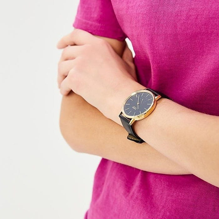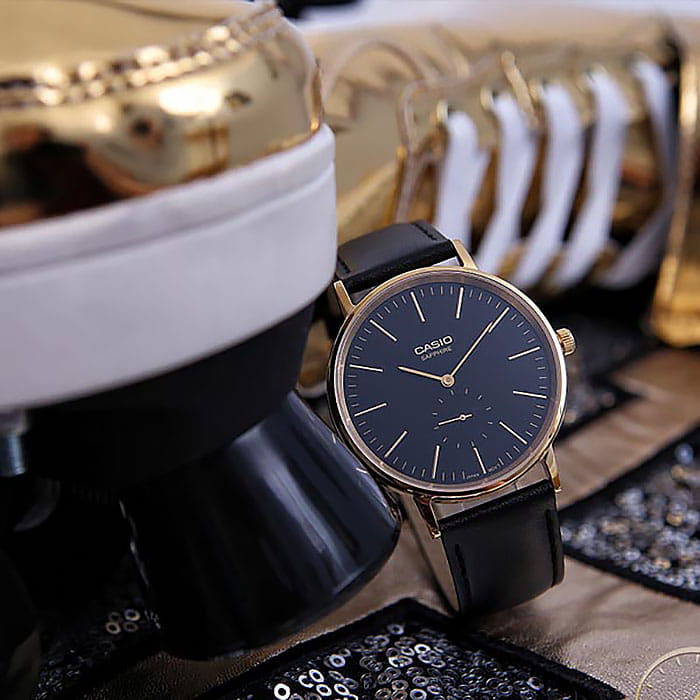 Удобные, стильные наручные часы от Casio являются воплощением практичности и элегантного дизайна. Круглый, золотой корпус выполнен из нержавеющей стали. Стильный черный ремень сделан из натуральной кожи. Сохранность часов обеспечивается прочным сапфировым стеклом. Временные отметки представлены в виде золотистых штрихов. Миниатюрная секундная стрелка вынесена на отдельный циферблат. Тип механизма - кварцевый. Вес аксессуара равен 40 граммам.