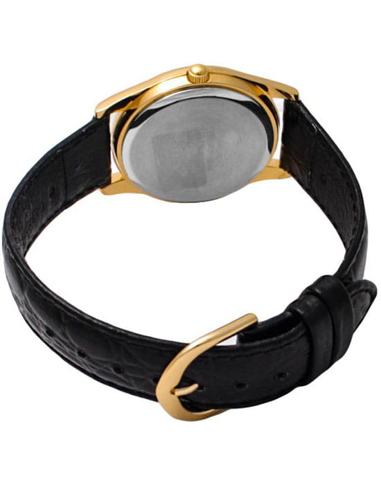 Аксессуар классического характера и со стильным дизайном придется по вкусу ценителям качества и комфорта. Часы прибавят привлекательности обладателю аксессуара своим гармоничным и ярким цветовым дизайном. Аккуратный корпус выполнен из латуни. Черный ремень из натуральной кожи сочетает в себе комфорт и долговечность. На циферблате традиционной формы расположены отчетливые временные отметки в виде золотых штрихов. Минеральное стекло надежно защищает часы от царапин. Компактное изделие весит 30 грамм. Тип механизма - кварцевый.
