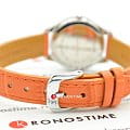 Наручные часы имеют элегантный дизайн, что делает их актуальным вариантом на долгие годы. Римские цифры наделяют модель оттенком винтажа, в качестве декора используются кристаллы Swarovski. Японский кварцевый механизм отличается высокой точностью хода. Яркая деталь – оранжевый ремешок из натуральной кожи. Возможности: отображение даты, люминесцентная подсветкаЛюминесцентное покрытиеПозволяет считывать показания времени в темноте. Производители наносят на стрелки, часовые индексы, безель или поверхность циферблата светонакопительный состав, дающий холодное свечение..