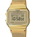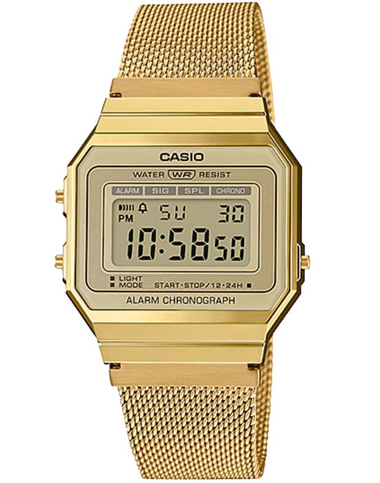 Спортивные японские часы-хронографХронографФункция позволяет измерять отрезки времени с особой точностью: часы, минуты, секунды. Верным признаком хронографа является наличие на циферблате 3 дополнительных окошек-счётчиков. с секундомеромСекундомерСекундоме́р — прибор, способный измерять интервалы времени с точностью до долей секунды. Casio Vintage A700WMG-9A, кварцевый механизм с высокой точностью. Издавая звуковой сигнал в установленное время, будильникБудильникБуди́льник — часы, в заданный момент времени подающие звуковой, световой и/или в редких случаях другой сигнал. напоминает о событиях, которые повторяются каждый день. Циферблат подсвечивается светодиодом. 12-ти и 24-х часовой формат времени. Корпус из нержавеющей стали. Класс водозащиты: 30 метров, позволит защитить корпус от случайных брызг или капель дождя. Стальной браслет миланского плетения на раскладном замке.