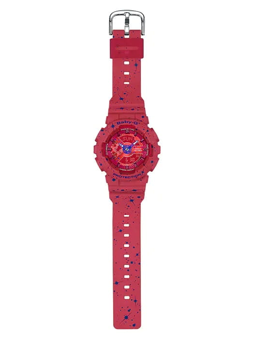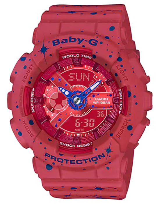 Женские противоударные японские наручные часы Casio Baby-G BA-110ST-4ADR, кварцевый механизм с высокой точностью. Класс водозащиты: 100 метров, позволит плавать, нырять и заниматься другими водными видами спорта. Корпус часов изготовлен из пластика, цвета.