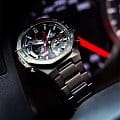 Японские мужские часы-хронографХронографФункция позволяет измерять отрезки времени с особой точностью: часы, минуты, секунды. Верным признаком хронографа является наличие на циферблате 3 дополнительных окошек-счётчиков. Casio Edifice ECB-950DC-1A . Tough SolarTough SolarТехнология основана на подзарядке аккумулятора от источника солнечного света, специальная панель улавливает солнечные лучи и преобразует их в энергию для работы часов. Достаточно пары минут нахождения на солнце для функционирования часов в течении суток., индикатор низкого заряда батареи. Функция автоматического сохранения энергии. Время работы аккумулятора без подзарядки приблизительно 6 месяцев, при включенной функции сохранения энергии приблизительно 19 месяцев. Двойная подсветка Super Illuminator с функцией Afterglow, одновременно подсвечивается аналоговый циферблат и цифровой дисплей. Люминесцентное покрытиеЛюминесцентное покрытиеПозволяет считывать показания времени в темноте. Производители наносят на стрелки, часовые индексы, безель или поверхность циферблата светонакопительный состав, дающий холодное свечение. Neobrite обеспечивает длительное послесвечение в темноте даже после кратковременного нахождения на свету. Таймер обратного отсчета от 1 сек до 24 ч. Мировое время – 39 городов (39 часовых поясов). Автоматический переход на зимнее и летнее время. Беспроводная технология BluetoothBluetoothСовременная технология, позволяющая синхронизировать часы с телефоном и переносить данные. Часы с Bluetooth расширяют возможности вашего смартфона и делают его использование ещё более удобным.. Приложение EDIFICE Connected позволяет вести журнал показаний секундомера и прохождения этапов, вычислять разность между заданным временем и временем этапа. Память на 200 этапов. Измерение скорости отображается на ретроградном циферблате в положении 4 часа. Функция перемещения стрелок для беспрепятственного просмотра информации на цифровых дисплеях, включения/отключения звука и поиска телефона. Заводная головка с защитой. Браслет с тройной раскладывающейся застежкой, расстегиваемой одним касанием. Стальной корпус, защищенный минеральным стекломМинеральное стеклоМинеральное стекло представляет собой искусственно выращенный минерал кварца. Такое стекло отличается особой устойчивостью к повреждениям и царапинам. Уступает по некоторым качествам сапфировому стеклу.. Стальной браслет на раскладной застёжкеРаскладная застёжкаТакой тип застёжки используется только на браслетах из металла. Она никогда не раскрывается полностью, происходит разделение на 2 и более частей. Раскладывающая застёжка снизит вероятность потери часов к минимуму.. СекундомерСекундомерСекундоме́р — прибор, способный измерять интервалы времени с точностью до долей секунды.. Класс водозащиты: 100 метров, позволит плавать, нырять и заниматься другими водными видами спорта.