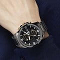 Кварцевый японский механизм Miyota. Точность хода не хуже -10 +15 сек./в месяц. Часы оснащены функцией хронографа, с точностью 1/10с и временем измерения 1ч. Циферблат черного цвета с контрастными элементами дизайна.  Флюорисцентное напыление на стрелках и дисплее часов позволяет отчетливее видеть каждую цифру. Корпус и браслет выполнены из нержавеющей стали с IP покрытием чёрного цвета. Минеральное стекло устойчиво к появлению царапин. Водонепроницаемость 100М. В часах можно плавать. Степень водонепроницаемости не является величиной, эквивалентной функциональной рабочей глубине.