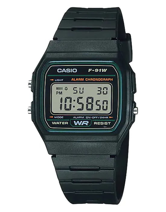 Электронные часы в чёрном исполнении напоминают первые модели от Casio благодаря винтажному 8-угольному ударопрочному корпусуУдаропрочный корпусМеханизм заключён в корпус, выполненный из современных материалов, устойчивых к ударам, механическим повреждениям и падению с высоты: инновационный пластик, карбон, нержавеющая сталь, титан., сделанному из надёжного пластика. Аксессуар с кварцевым механизмом работает от батарейки, характеризующейся высоким сроком службы - до 7 лет. Циферблат оснащён светодиодной микроподсветкойСветодиодная подсветкаСветодиодная или LED-подсветка обеспечивает появление яркого холодного свечения за счёт LED-элементов - маленьких лампочек. Они потребляют минимальное количество энергии, чаще всего можно встретить 1 светодиод, в нижней части циферблата., освещающей его сбоку. Органическое стекло легко полируется. Гибкий полимерный ремешок. Ежедневный будильник, секундомер, автоматический календарь, 12 и 24-х часовое отображение времени. Габариты: 33,2 x 38 x 8,5 мм.