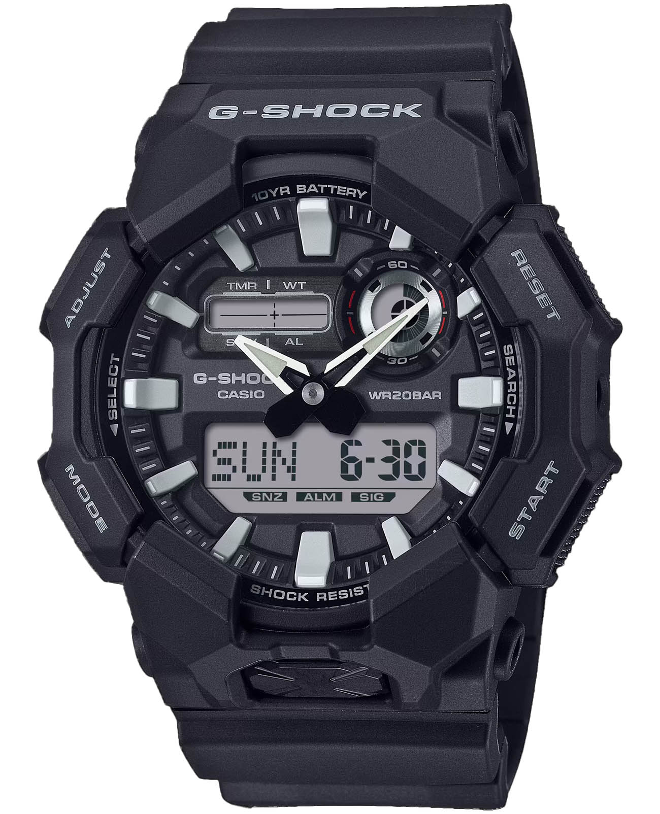 Японские мужские многофункциональные часы Casio GA-010-1A. Функции: автоматическая светодиодная подсветка, ударопрочный корпусУдаропрочный корпусМеханизм заключён в корпус, выполненный из современных материалов, устойчивых к ударам, механическим повреждениям и падению с высоты: инновационный пластик, карбон, нержавеющая сталь, титан., функция Мирового времениМировое время Полезное часовое усложнение, отображающее время в основных городах и известных областях по всему миру, оно связано с часовыми поясами, удобно для путешественников и бизнесменов. , секундомерСекундомерСекундоме́р — прибор, способный измерять интервалы времени с точностью до долей секунды., таймерТаймерОтсчитывает секунды в обратном направлении в заданном интервале времени., 5 будильниковБудильникБуди́льник — часы, в заданный момент времени подающие звуковой, световой и/или в редких случаях другой сигнал., автоматический календарь, 12/24 отображение времени. Минеральное стеклоМинеральное стеклоМинеральное стекло представляет собой искусственно выращенный минерал кварца. Такое стекло отличается особой устойчивостью к повреждениям и царапинам. Уступает по некоторым качествам сапфировому стеклу. устойчивое к появлению царапин, обладающее высокой прозрачностью. Класс водозащиты: 200 метров, позволит плавать, нырять и заниматься другими водными видами спорта. Срок жизни батареи 10 лет. Габариты (Ш x В x Г) 55,1 х 51,9 х 17,5. Вес 67 г.