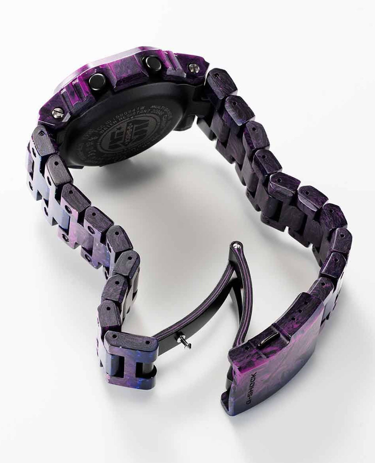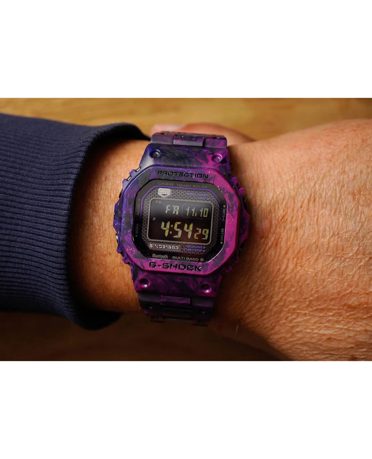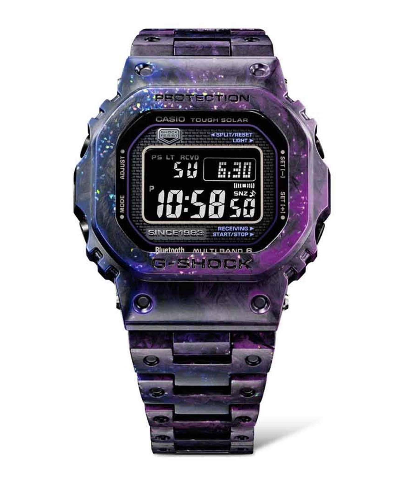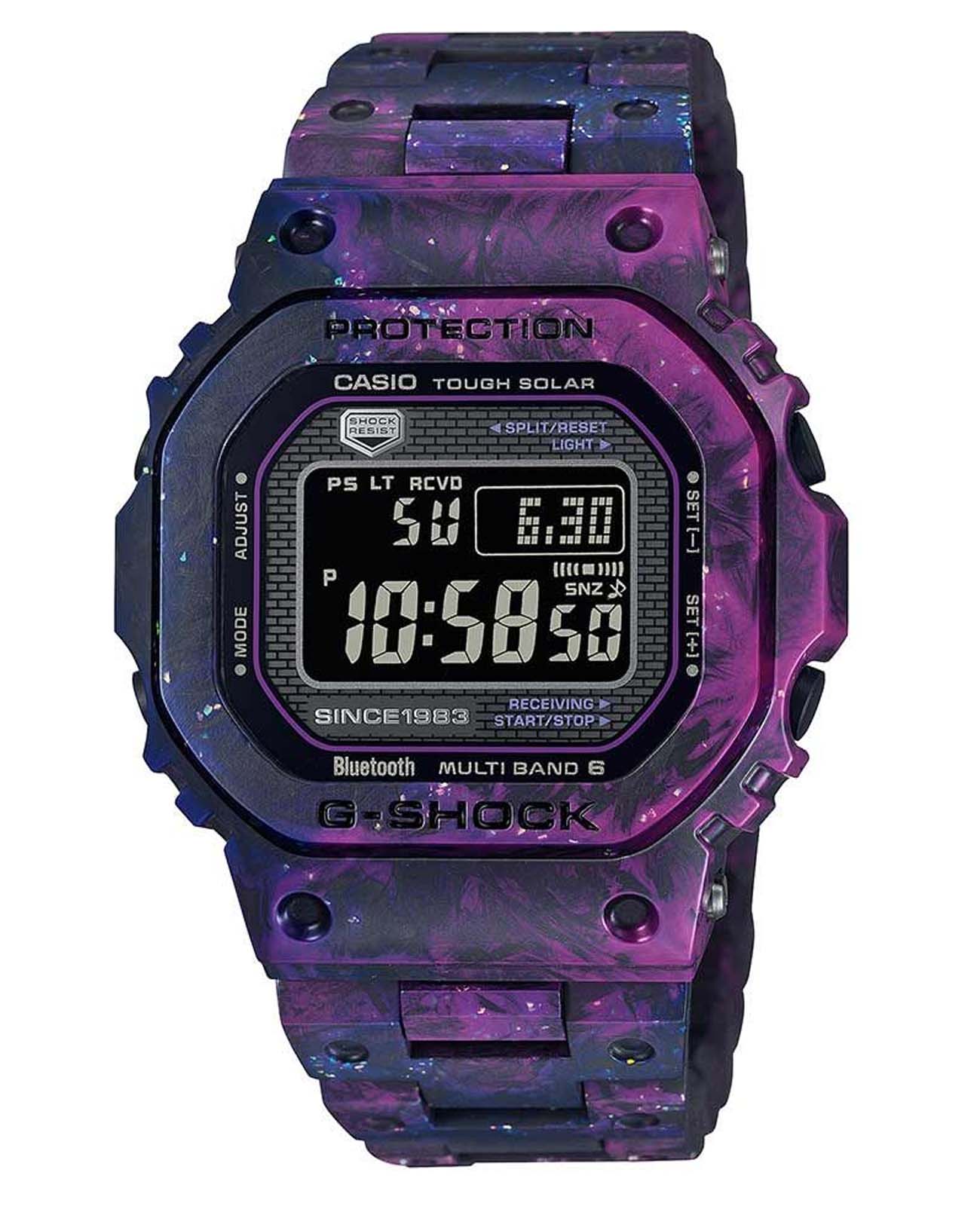 Японские мужские часы Casio G-Shock GCW-B5000UN-6. Перед вами исторический релиз от Casio — лимитированная модель G-SHOCK в легендарном олдскульном корпусе GCW-B5000 впервые выполненном из карбона, выпущенная в честь 40-летия бренда G-SHOCK. Модель получила уникальную космическую расцветку, которую можно долго разглядывать и находить в ней туманности, галактики, звезды и их скопления. БезельБезельВнешний ободок, закрепляющий стекло. В спортивных часах так называется поворотное кольцо с делениями на циферблате, выполняет роль таймера – замеряет отрезки времени на шкале. Неподвижный безель – элемент декора. Однонаправленно вращающийся безель на дайверских часах позволяет фиксировать моменты погружения и выныривания на поверхность. и ремешок изготовлены из кованого карбонаКарбонОт «carbon», «carbone» - углерод, углепластик - полимерный композиционный материал из переплетённых под определенным углом между собой нитей углеродного волокна, применяется для изготовления лёгких, но прочных деталей. В часах часто используют для украшения циферблатов и ремешков. Так же карбон используется в изготовлении корпусов. Такие корпуса обладают антикоррозионным свойством, не поддаются электромагнитному излучению, обладают повышенной прочностью и противоударностью., которому можно придавать сложные формы. Для застежки браслета инженеры Casio использовали многослойный карбон для достижения максимальной прочности на изгиб, который требует данная деталь. Металлические детали: кнопки и внутреннее безельное кольцо созданы из титана, что сделало вес часов на полном браслете невероятным — всего 65 грамм. Сапфировое стеклоСапфировое стеклоПрочный и надёжный материал из кристалла сапфира синтетического происхождения, характеризующийся особой твёрдостью и устойчивостью к царапинам и повреждениям. устойчивое к появлению царапин, обладающее высокой прозрачностью. Светодиодная подсветкаСветодиодная подсветкаСветодиодная или LED-подсветка обеспечивает появление яркого холодного свечения за счёт LED-элементов - маленьких лампочек. Они потребляют минимальное количество энергии, чаще всего можно встретить 1 светодиод, в нижней части циферблата. (Super Illuminator), послесвечение. 12/24-часовой формат. Вечный календарьВечный календарьКлассическое часовое усложнение, представляющее собой календарь, рассчитанный на несколько лет вперёд (стандартно – до 2099 года). Определяет текущую дату, день недели, месяц.. СекундомерСекундомерСекундоме́р — прибор, способный измерять интервалы времени с точностью до долей секунды.. ТаймерТаймерОтсчитывает секунды в обратном направлении в заданном интервале времени.. 5 ежедневных будильников (с 1 будильником повтора). Часовой сигнал времени. Включение/выключение звукового сигнала кнопки управления. Мировое время Мировое время Полезное часовое усложнение, отображающее время в основных городах и известных областях по всему миру, оно связано с часовыми поясами, удобно для путешественников и бизнесменов. 39 часовой пояс (39 городов + всемирное координированное время UTCUTCВсемирное кординационное время, не имеющее привязки к географическому положению Гринвича, основывается на атомном отсчёте времени. Регулировка времени осуществляется более точно, чем устаревшее GMT.