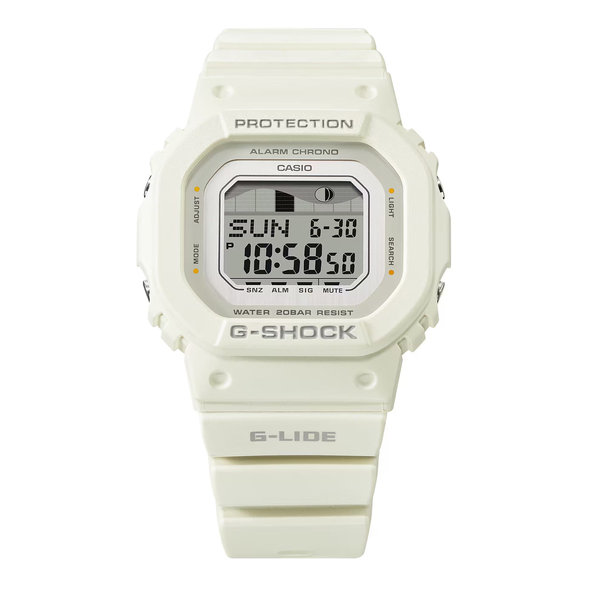 Женские часы-хронографХронографФункция позволяет измерять отрезки времени с особой точностью: часы, минуты, секунды. Верным признаком хронографа является наличие на циферблате 3 дополнительных окошек-счётчиков. Casio G-Shock GLX-S5600-7B из коллекции G-Shock. Винтажная модель в новой цветовой гамме корпуса и ремешка понравится поклонникам серфинга. G-Lide. Модель часов создана на базе GLX-5600. Минеральное стеклоМинеральное стеклоМинеральное стекло представляет собой искусственно выращенный минерал кварца. Такое стекло отличается особой устойчивостью к повреждениям и царапинам. Уступает по некоторым качествам сапфировому стеклу. устойчивое к появлению царапин, обладающее высокой прозрачностью. Ударопрочный корпусУдаропрочный корпусМеханизм заключён в корпус, выполненный из современных материалов, устойчивых к ударам, механическим повреждениям и падению с высоты: инновационный пластик, карбон, нержавеющая сталь, титан. защищает механизм от ударов и вибрации. Электролюминесцентная подсветкаЭлектролюминесцентная подсветкаЭлектролюминесцентная панель устанавливается под ЖК-экраном часов, при нажатии кнопки электричество преобразуется в свет за счёт подачи напряжения на атомы фосфора, такой тип подсветки позволяет освещать весь циферблат. освещает весь циферблат. Мировое времяМировое время Полезное часовое усложнение, отображающее время в основных городах и известных областях по всему миру, оно связано с часовыми поясами, удобно для путешественников и бизнесменов. – 48 городов (29 часовых поясов). СекундомерСекундомерСекундоме́р — прибор, способный измерять интервалы времени с точностью до долей секунды. с точностью измерения 1/100 секунды и измерением до 23 часов 59 минут 59,99 cек. ТаймерТаймерОтсчитывает секунды в обратном направлении в заданном интервале времени. обратного отсчета (диапазон времени 24 часа), автоматический календарь, 12/24 отображение времени. 3 будильникаБудильникБуди́льник — часы, в заданный момент времени подающие звуковой, световой и/или в редких случаях другой сигнал., один с функцией Snooze, ежечасный сигнал. Отображение возраста и фазы Луны. Графическое отображение сведений о приливах и отливах на заданную дату и время. Класс водозащиты: 200 метров, позволит плавать, нырять и заниматься другими водными видами спорта. Ремешок из полимерного материала на стандартной застежке.