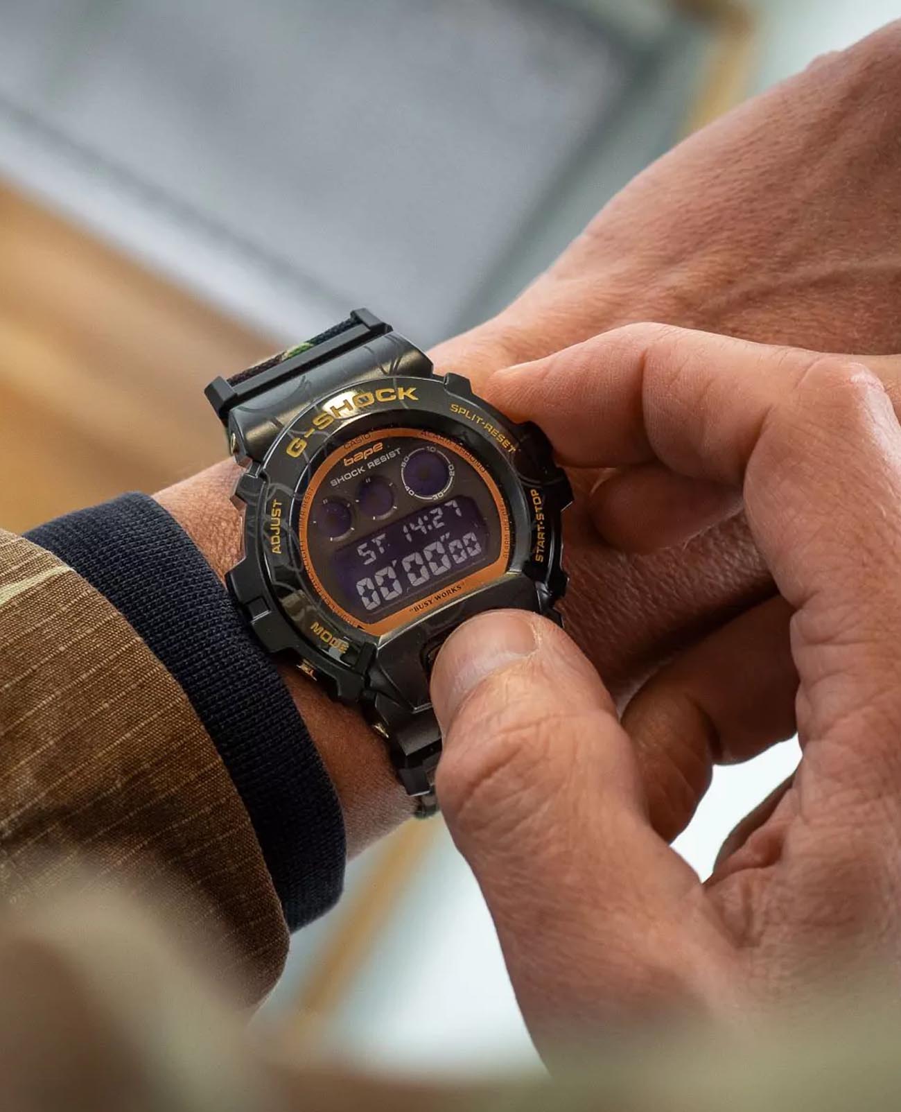 Японские мужские часы Casio G-Shock DW-6900NNJ-1ER. Эта новая специальная модель BAPE, посвященная 30-летию, является результатом сотрудничества между BATHING APE® и G-SHOCK. Компания G-SHOCK стала первопроходцем концепции надежности хронометража и постоянно совершенствует ее на протяжении 40 лет. В результате сотрудничества BAPE® и G-SHOCK GM-6900 стал первой моделью, оснащенной металлическим безелемБезельВнешний ободок, закрепляющий стекло. В спортивных часах так называется поворотное кольцо с делениями на циферблате, выполняет роль таймера – замеряет отрезки времени на шкале. Неподвижный безель – элемент декора. Однонаправленно вращающийся безель на дайверских часах позволяет фиксировать моменты погружения и выныривания на поверхность.. Корпус полностью покрыт камуфляжем BAPE®, а кольцо вокруг циферблата имеет металлическую отделку золотого цвета. На передней кнопке нанесена буква B, обозначающая BAPE®. Ударопрочный корпусУдаропрочный корпусМеханизм заключён в корпус, выполненный из современных материалов, устойчивых к ударам, механическим повреждениям и падению с высоты: инновационный пластик, карбон, нержавеющая сталь, титан. защищает механизм от ударов и вибрации. Минеральное стеклоМинеральное стеклоМинеральное стекло представляет собой искусственно выращенный минерал кварца. Такое стекло отличается особой устойчивостью к повреждениям и царапинам. Уступает по некоторым качествам сапфировому стеклу. устойчивое к появлению царапин, обладающее высокой прозрачностью. Светодиодная подсветкаСветодиодная подсветкаСветодиодная или LED-подсветка обеспечивает появление яркого холодного свечения за счёт LED-элементов - маленьких лампочек. Они потребляют минимальное количество энергии, чаще всего можно встретить 1 светодиод, в нижней части циферблата.. 12/24-часовой формат. вечный календарьВечный календарьКлассическое часовое усложнение, представляющее собой календарь, рассчитанный на несколько лет вперёд (стандартно – до 2099 года). Определяет текущую дату, день недели, месяц.. СекундомерСекундомерСекундоме́р — прибор, способный измерять интервалы времени с точностью до долей секунды.. ТаймерТаймерОтсчитывает секунды в обратном направлении в заданном интервале времени.. Часовой сигнал времени. Многофункциональный будильник. Оповещение о вспышке мигает с зуммером, который сигнализирует о тревогах, сигналах часового времени, сигнале таймера обратного отсчета времени. Класс водозащиты: 200 метров, позволит плавать, нырять и заниматься другими водными видами спорта. Ремешок из полимерного материала на стандартной застежке. В комплекте имеется сменный тканевый ремешок.
