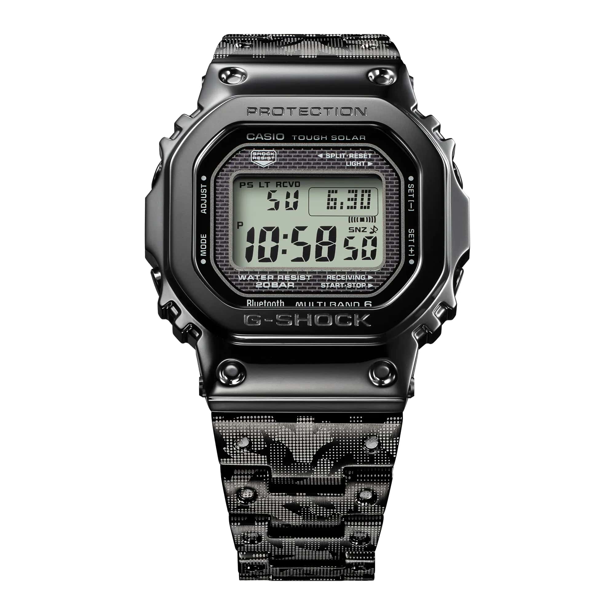Внешний вид отличается оригинальностью, Полоса из нержавеющей стали покрыта IP-покрытиемIP-покрытиеМетод ионного напыления. Демонстрирует повышенную устойчивость к истиранию, окислению и химическим веществам. Под воздействием высокого давления и температуры около 1500°C молекулы металла надёжно соединяются с частицами корпуса часов. черного цвета с оригинальной графикой Haze. Стиль ретро незримо присутствует благодаря 8-угольному ударопрочному корпусуУдаропрочный корпусМеханизм заключён в корпус, выполненный из современных материалов, устойчивых к ударам, механическим повреждениям и падению с высоты: инновационный пластик, карбон, нержавеющая сталь, титан., напоминающему первые модели от Casio. Его конструкция подразумевает наличие металлической капсулы с кварцевым механизмом. Наручные часы заряжаются от солнечной батареи – технология , специальный индикатор показывает состояние батареи. LED-подсветкаСветодиодная подсветкаСветодиодная или LED-подсветка обеспечивает появление яркого холодного свечения за счёт LED-элементов - маленьких лампочек. Они потребляют минимальное количество энергии, чаще всего можно встретить 1 светодиод, в нижней части циферблата. экрана. Водостойкость 20 бар. Надёжное минеральное стекло. Дополнительные возможности: Bluetooth-синхронизацияBluetoothСовременная технология, позволяющая синхронизировать часы с телефоном и переносить данные. Часы с Bluetooth расширяют возможности вашего смартфона и делают его использование ещё более удобным., приём радиосигнала, мировое времяМировое время Полезное часовое усложнение, отображающее время в основных городах и известных областях по всему миру, оно связано с часовыми поясами, удобно для путешественников и бизнесменов. , будильник, таймер, секундомер, автоматический календарь. Габариты: 43,2 x 49,3 x 13 мм.